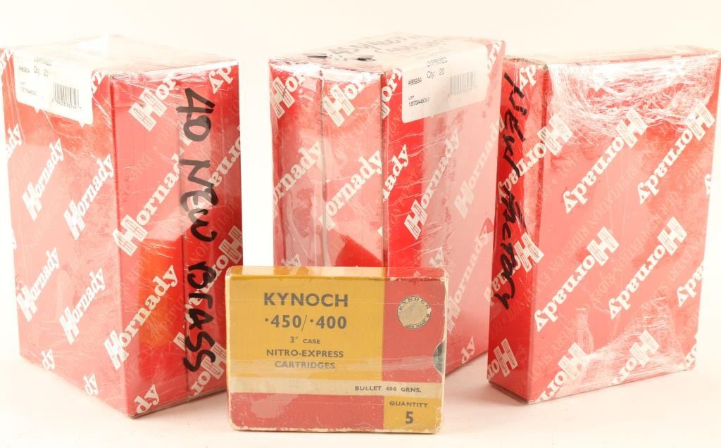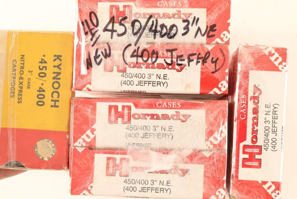 Including 100 rds of new in box Hornady 450/400 3" unprimed brass and 5 rds of 450/400 nitro-express cartridges.
