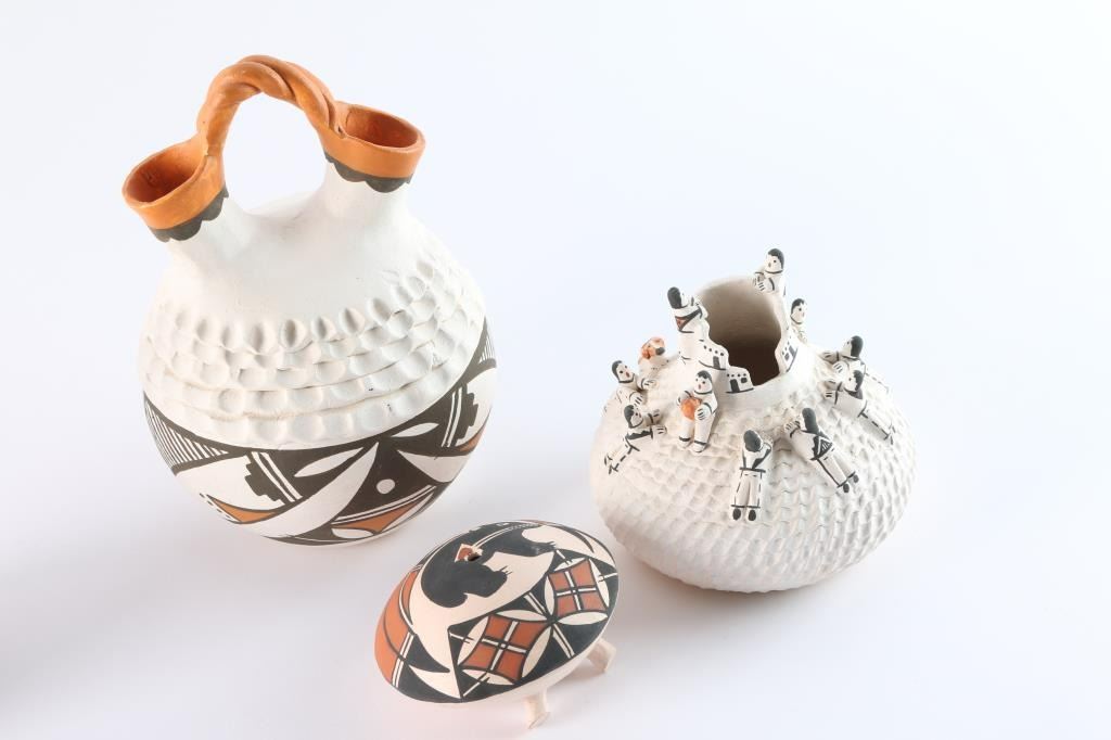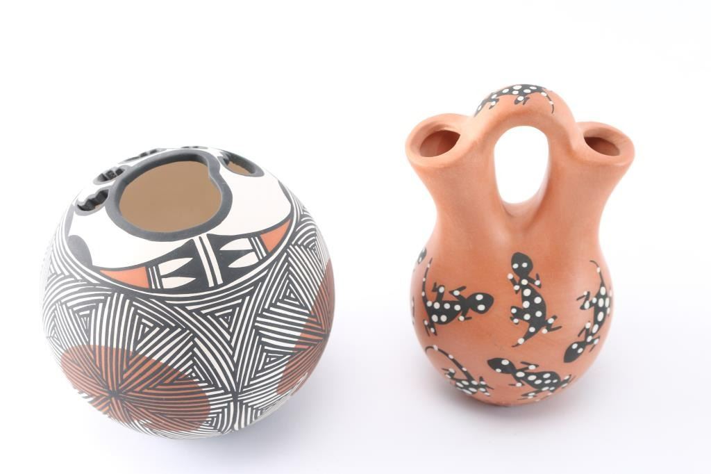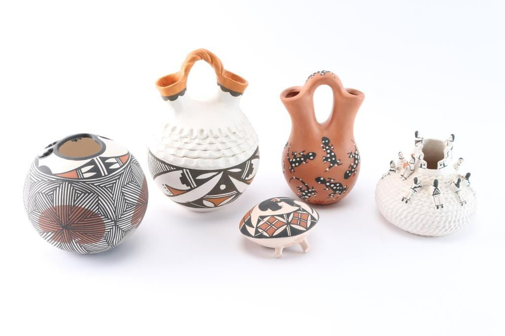 Signed Norma Jean Wedding vessel, 8" x 5". Signed Kuutimaits!a lizard pot, 6-1/2" x 3". Footed seed pot with bear motife, sigened D & J Trujillo, 4" x 4". Bear paw print geometric pot, signed Susan Sarracino, 5" x 4". Small storyteller pot, signed Corrine, 3" x 4"