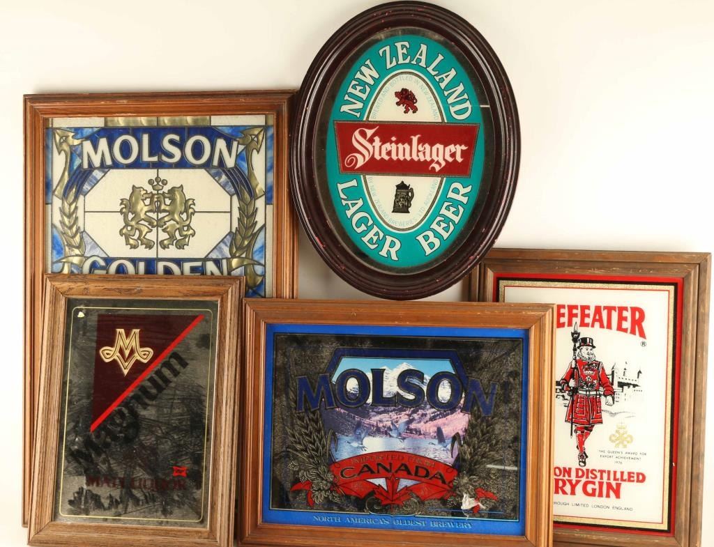 Includes beer mirrors from "Magnum Malt Liquor", "Beefeater London Distilled Dry Gin", "Molson", Steinlager" and "Molson Golden".