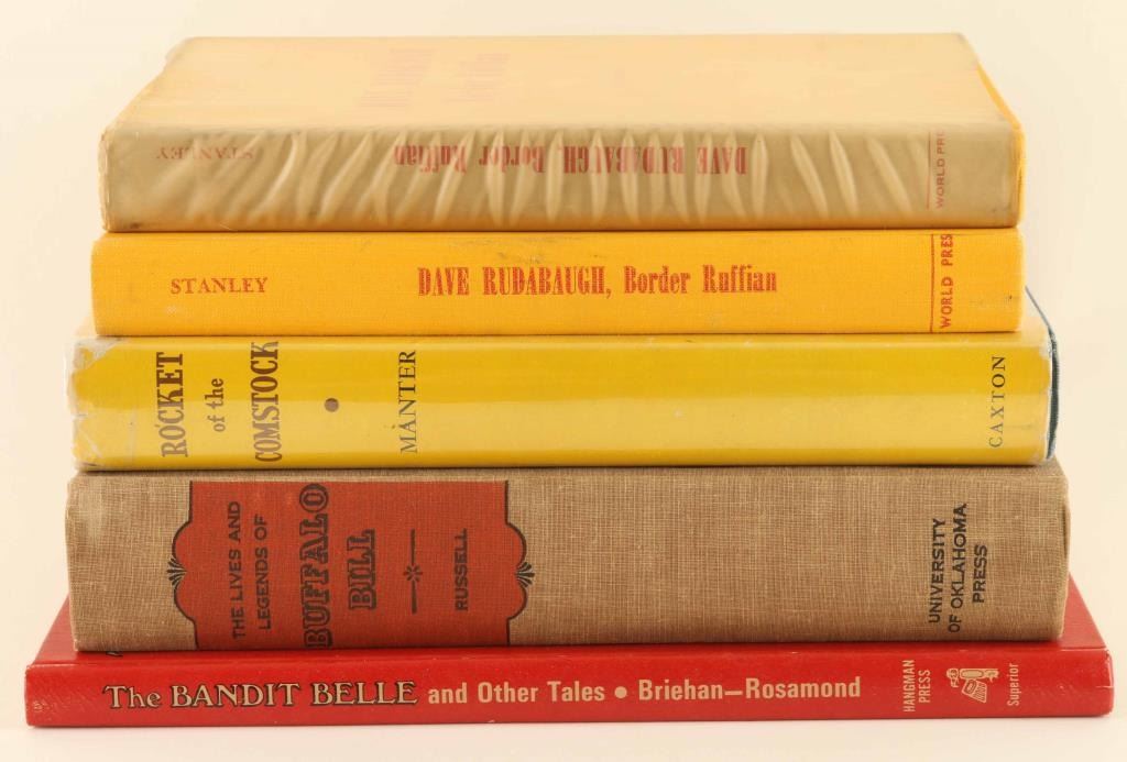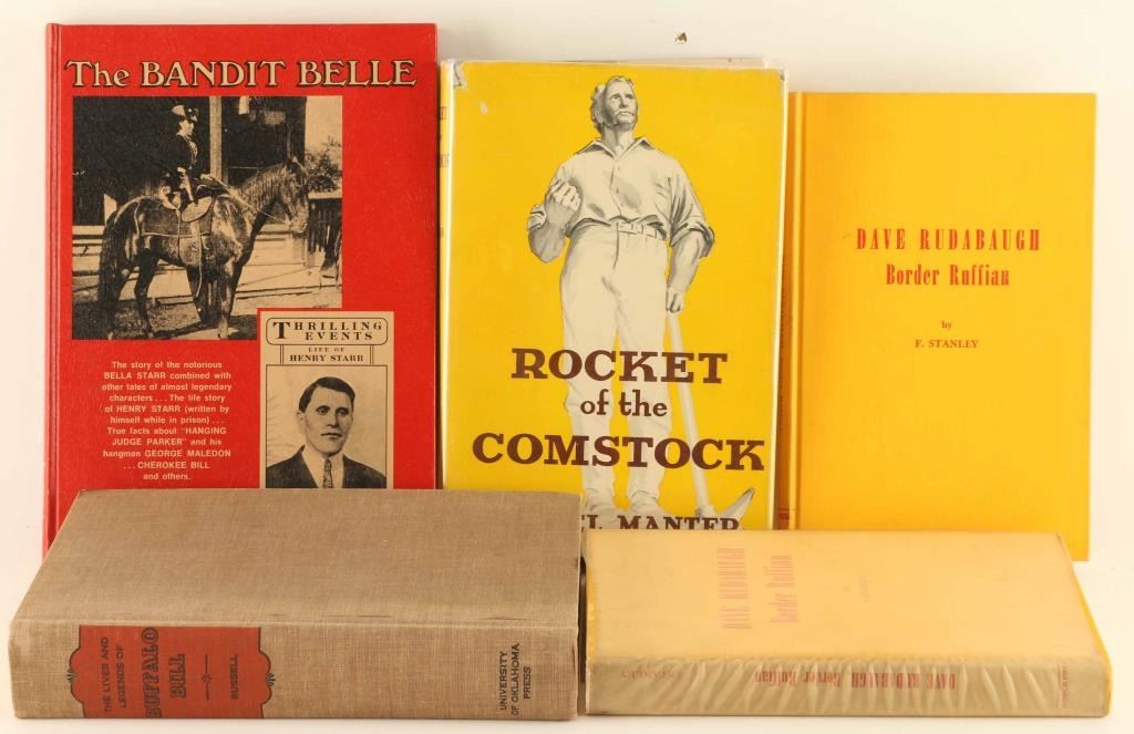 Includes First Edition copy of "The Lives and Legends of Buffalo Bill" by Don Russell and signed on the first page "For Arnold Chernoff, recalling our association in The Westerners -Don Russell", First edition copy of "The Bandit Belle' by Carl W. Breihan with Charles A. Rosamond, First Edition "Rocket of the Comstock" by Ethel Manter, and (2) First Edition Copies of "Dave Rudabaugh Border Ruffian" with one the the copies having a signature on the first page.