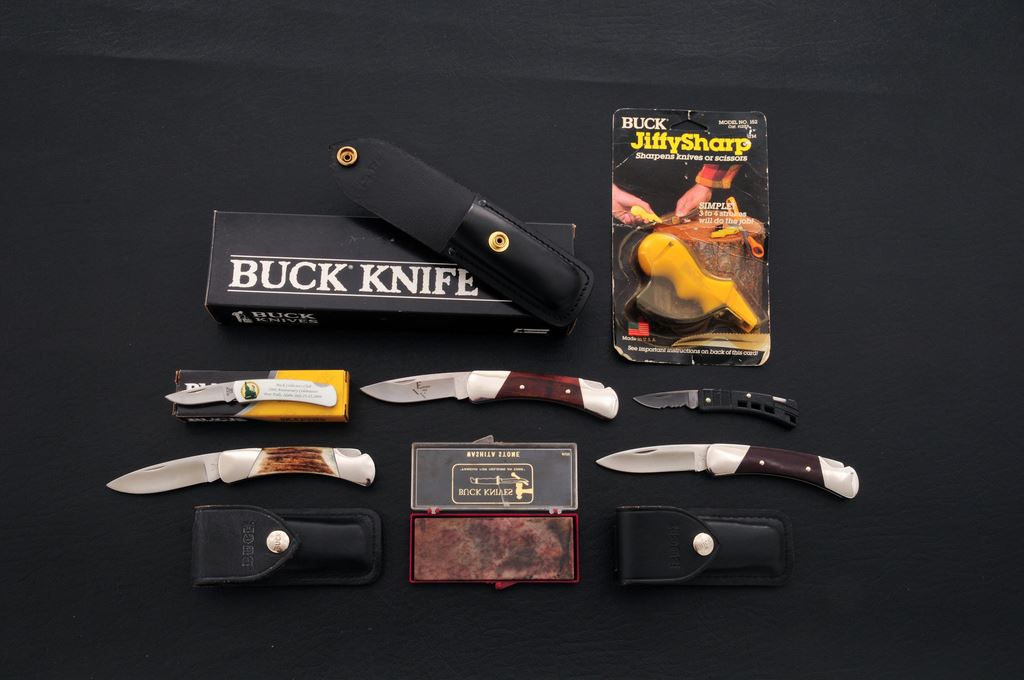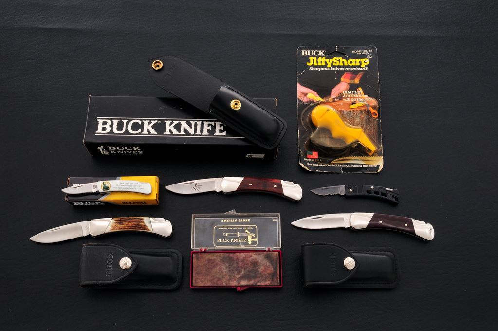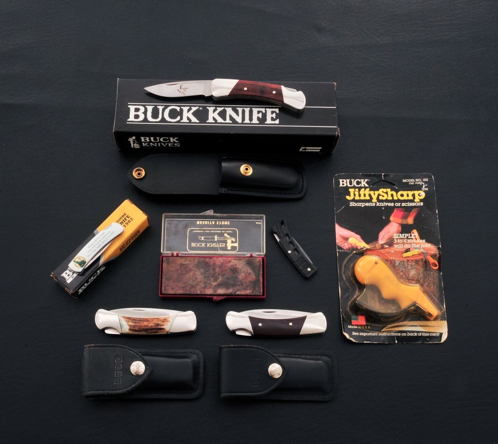 Lot of Five (5) Buck Folding Knives & Two (2) Sharpening Devices, including a Collector's Club Anniversary Knife: 1.) Model 500 ''Duke'' with wood handles. Blade is marked ''Enviro-Tex''. In original box with factory sheath and misc. paperwork. 2.) Model 500 ''Duke'' with micarta handles. In original sheath. 3.) Model 500 ''Duke'' with stag handles. In original sheath. 4.) Model 525 ''Gent'' Collector's Club knife, commemorating the 20th anniversary celebration in Post Falls, Idaho, July 23-25, 2008. In original box with paperwork. 5.) ''Jiffy Sharp'' knife and scissor sharpener, sealed in the original packaging. 6.) Washita Stone in original plastic case. 7.) Model 425 ''MiniBuck'' folding knife. All of the knives are in near excellent to excellent condition. Blades are unused. Bolsters on a few of the Model 500s show light handling or rub marks. The Washita stone appears to have been lightly used. Jiffy Sharp is new and still sealed, packaging shows some age and wear. Est.: $150-$300/lot.