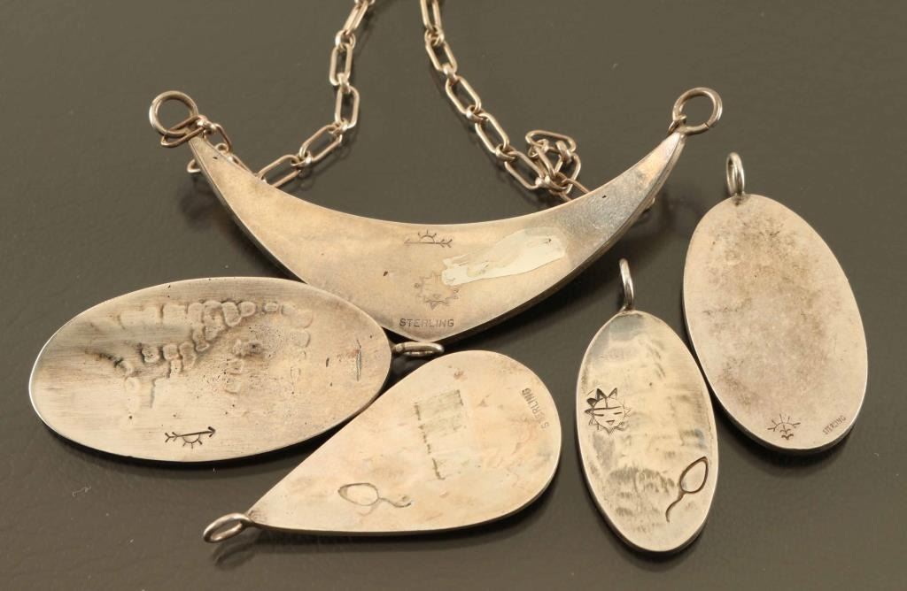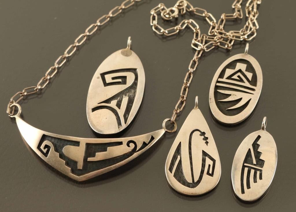 (1) Leonard Shupla Pendant (2) Duane Koinva one necklace and one pendant (2) Loren Qumawunu two pendants From the Spike Flanders Collection Silver City New Mexico.