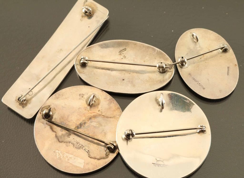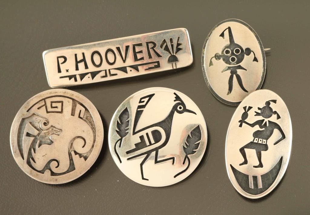 (1) Mudhead Pin made and marked by Harrington Poleviyuma (1) Kachina Dancer Pin made by James Selina (1) P. Hoover Monogramed Pin made by Lucinda Taylor (1) Roadrunner Pin made by Weaver Salina (1) Geometric Design Pin/pendant made by Earl Yowytewa All sterling all marked