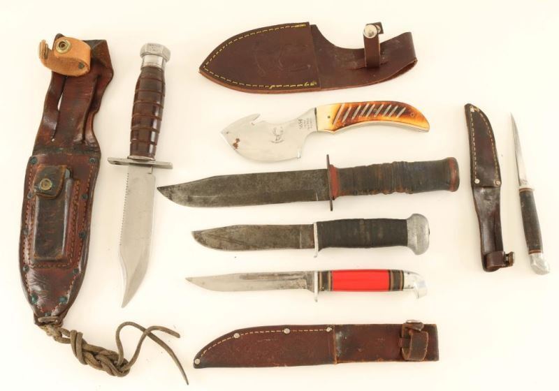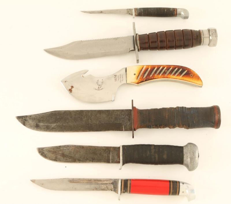 Including; bone edge knife with an antler handle and stainless steel blade 7 1/2" overall with a 3" blade includes leather scabbard, Kbar type knife with leather stacked handle '1967 Calumus NY' 9 1/2" overall 5" blade, Kbar style fighting knife unmarked 10 1/2" overall with a 6" blade, Remington knife with leather stacked handle 8" overall 4" blade, small boot dagger 'KINFCKS' leather stacked handle 6" overall with 3" blade, and a Western Field knife red and black synthetic handle 8" overall 3" blade includes leather sheath.