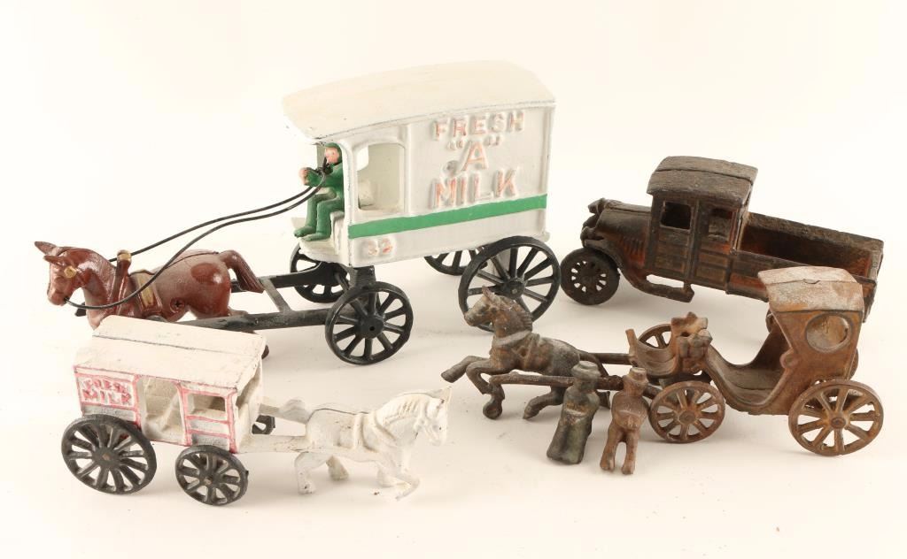 Including; 2 horse drawn buggies, a Model T type truck, a milk buggy and a fresh milk trailer