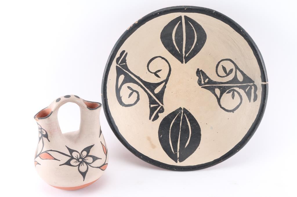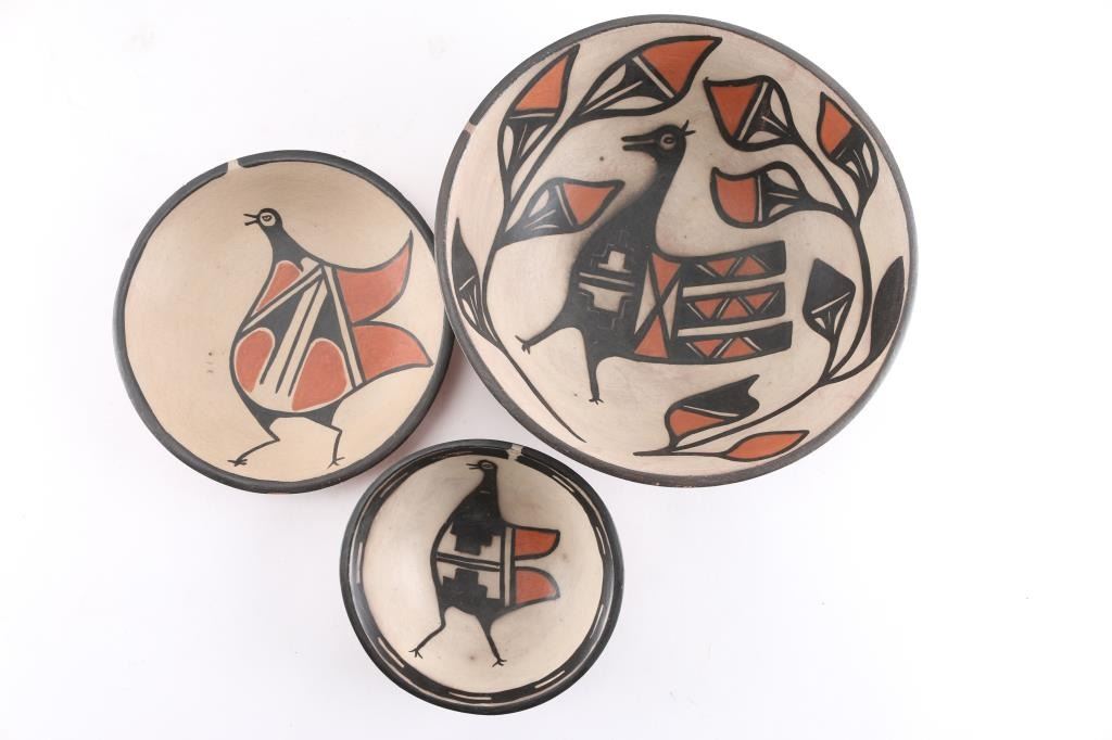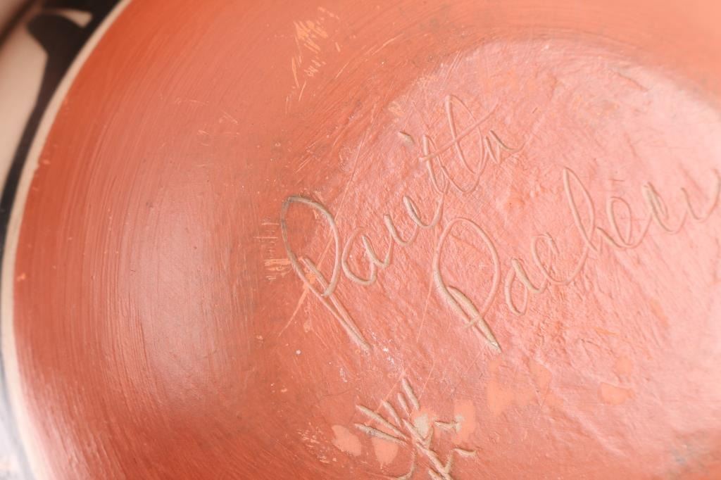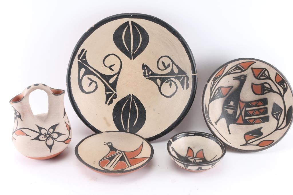 1 large black and white pot measures 13" x 2", bird pot 10" x 3", bird dish signed Pachelo 7-1/2" x 3", small bird bowl 6" x 2", bird motif wedding pot 8" x 6".