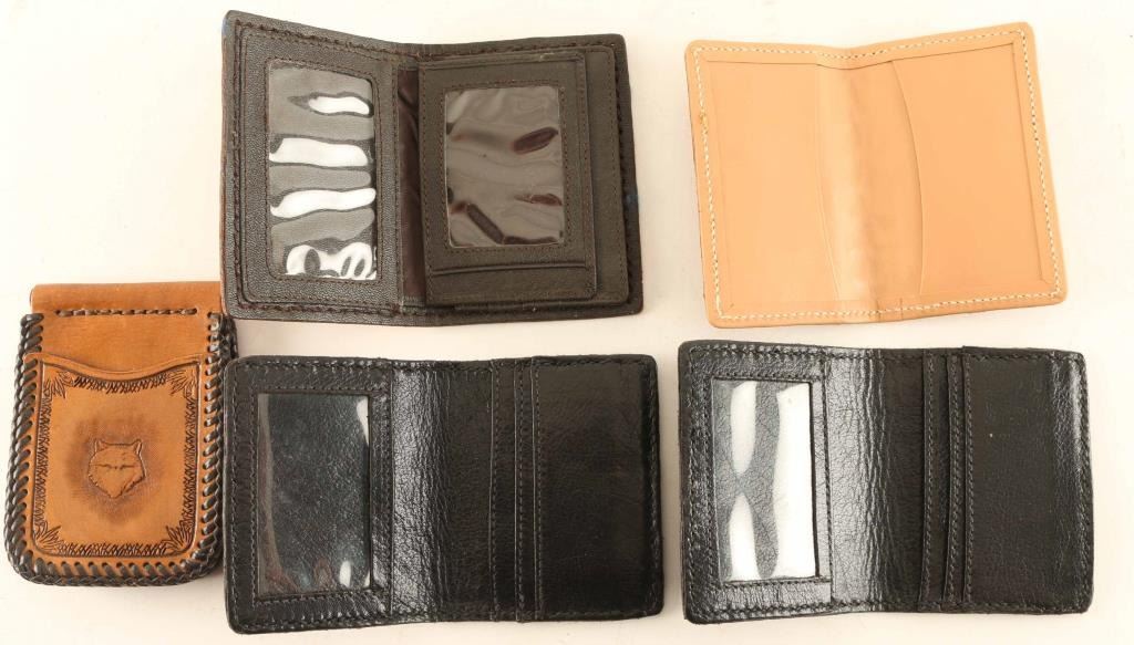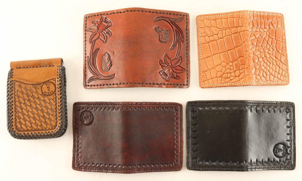 Lot includes (2) tooled ID/Credit card wallets, (1) business card holder, (1) Money clip with card holder, (1) ID Wallet. From Arizona Leathersmith Bill Myers, all genuine leather.
