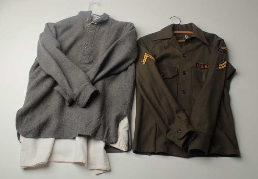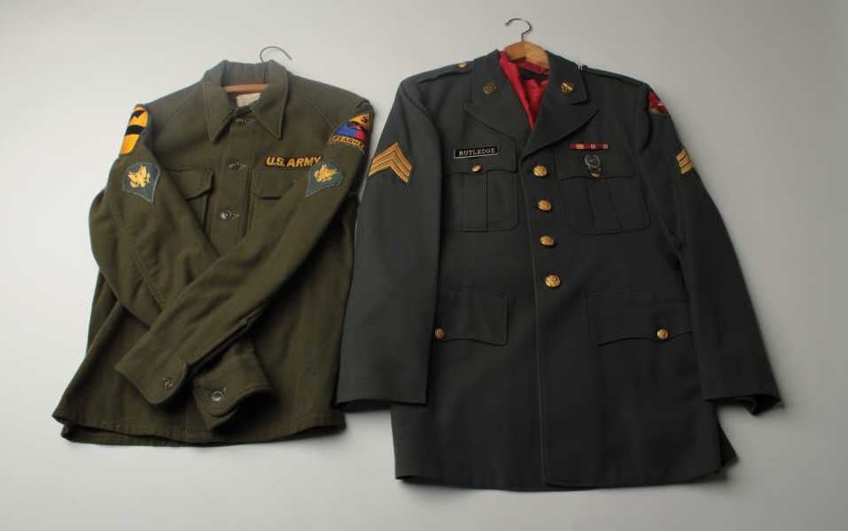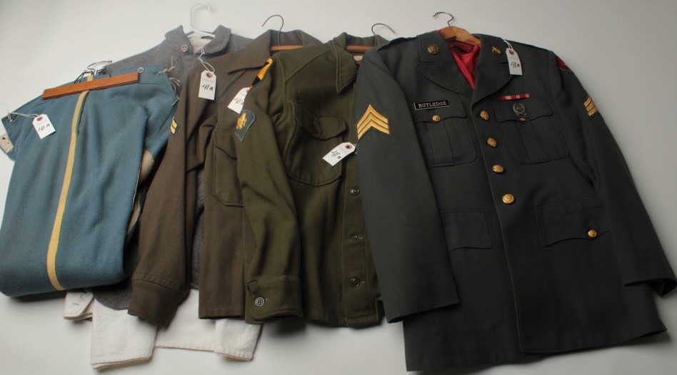Lot of 5 misc. uniforms; 2 Korean War era shirts with insignia in good condition; 1 Vietnam era complete dress uniform with insignia in good condition and 2 reproduction Confederate pieces; 1 coat and 1 pants; good condition. Est.: $100-$200.