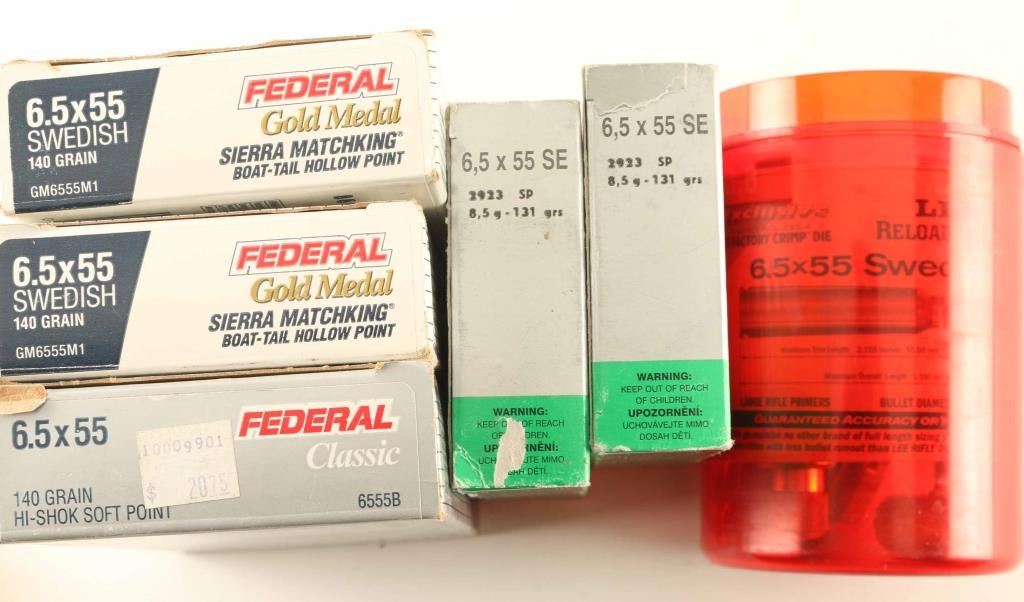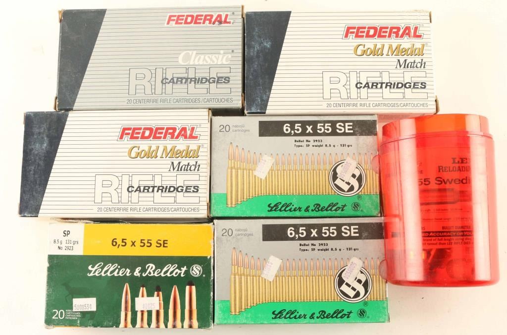 includes approximately 85rds of 6.5 x 55 SE from various makers, and lot also includes reloading dies for 6.5 x 55 SE ammo.