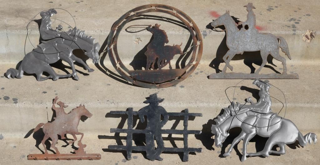 Set of 6 Metal Western Cowboy Wall hangings. Horse Riding, Roping Cowboy Designs. Between 12” and 16” tall.