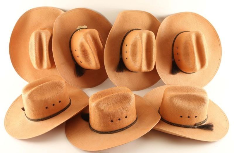 Tan straw hats with woven horsehair hatbands, size 6 3/4.