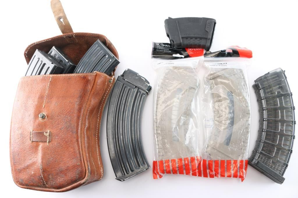 Original Czech VZ58 30 Round Magazines, Set of Four in Czech military brown leather four- magazine Pouch, 7.62x39, for use in the Czech vz 58 'AK-47 style assault rifle. Magazines and pouch show wear but very good condition. Two FAB Defense tan polymer 30-rd magazines, one Czech Small Arms clear 30-rd magazine and one FAB black polymer 10-rd magazine. 8 magazines total.