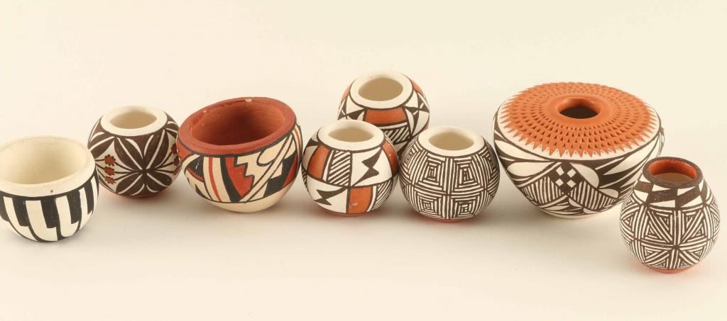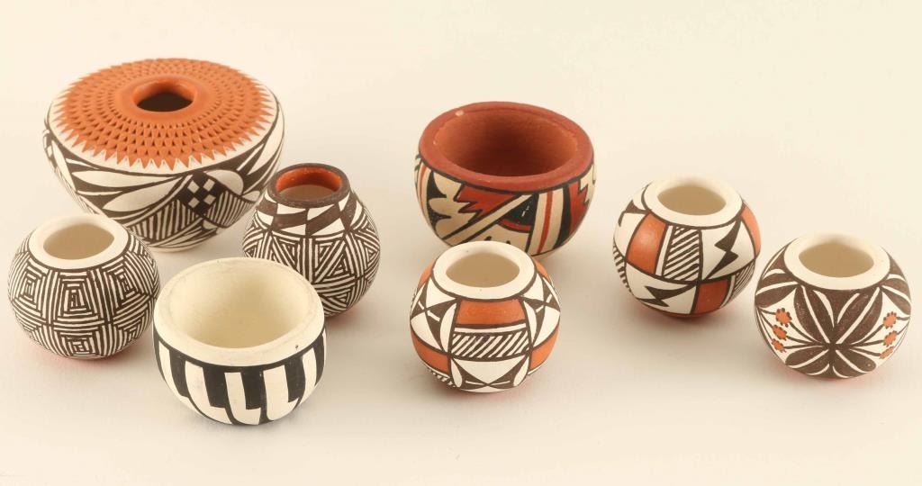 Lot includes (6) tiny Acoma pots signed on the base by "A. Roy", and the other (2) are signed but hard to read. All but (2) of them have a white, orange, and black color scheme while the two have only white and orange.