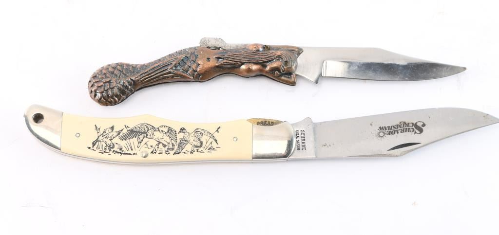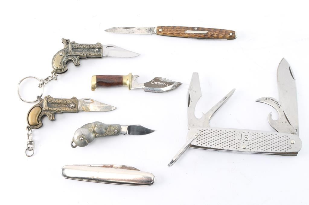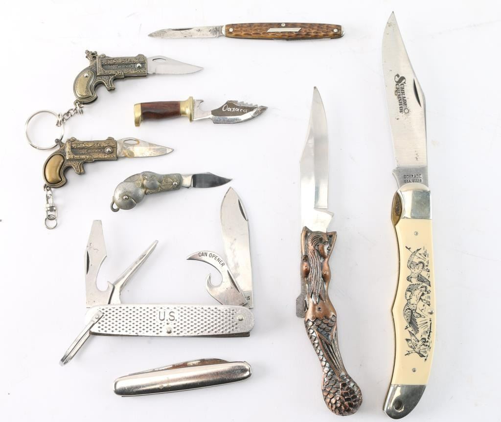 Includes: (2) miniature knives with handles shaped like flintlock pistols. 1-1/4" blade, 3" overall. (1) Miniature knife with rat shaped handle. 1" blade, 3" overall. Blade marked "Art". (1) Bottle opener knife. 1-3/4" blade, 3" overall. "Oaxaca" on blade. (1) Folding knife with 1-3/4" blade and 1" file. (1) Folding knife with 2-1/4" blade. (1) Multi-purpose folding knife with 2-1/2" blade, can opener, bottle opener, and screwdriver. "U.S." Stamped on side. (1) Schrade Scrimshaw folding knife with 3-3/4" blade, 9-1/4" overall. Ducks on one side of handle and a place for engraving on other. (1) Folding knife with mermaid handle. 3' blade, 7-1/2" overall.