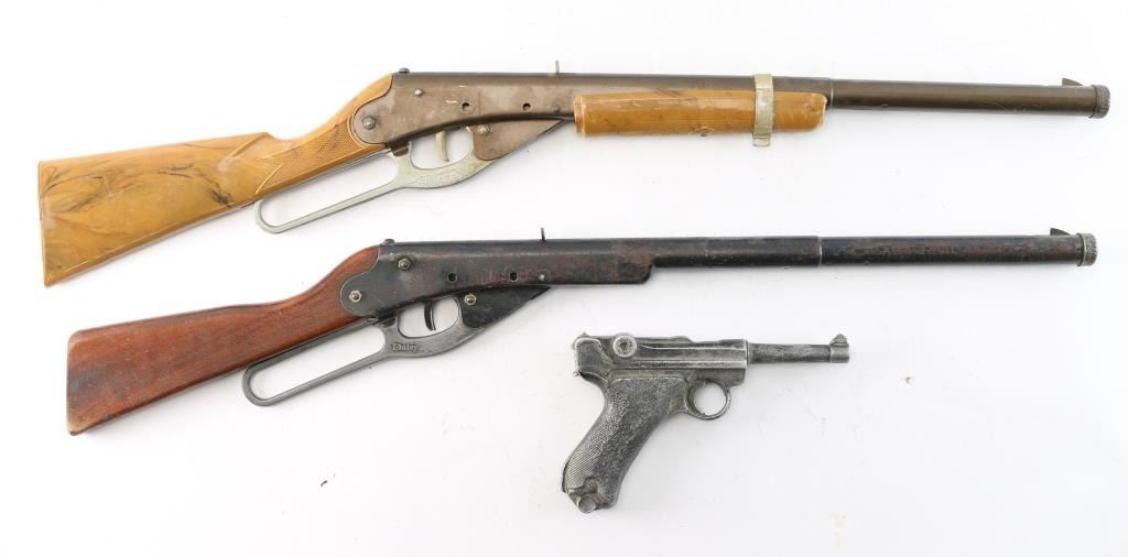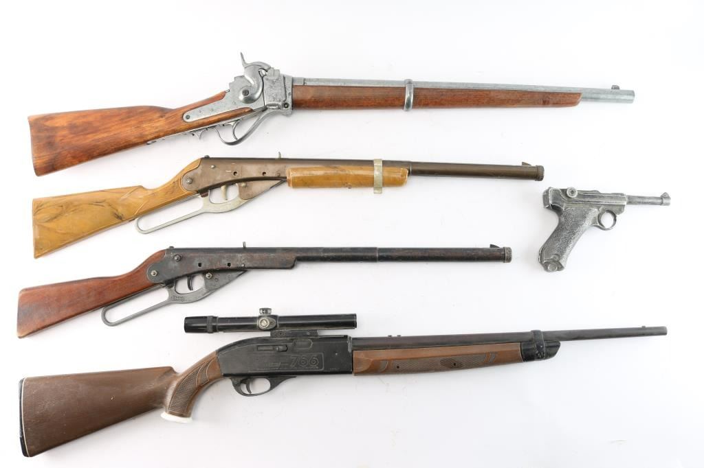 Includes: (1) Crossman 766 .177 pellet/BB repeater with Bushnell scope. (1) J.C. Higgens lever action BB gun with synthetic stock and forend.. Model 799.92. (1) Daisy lever action BB gun with wood stock. (1) Vintage copy of a Sharps rifle. Working action. (1) Vintage cast aluminum P08 Luger toy.