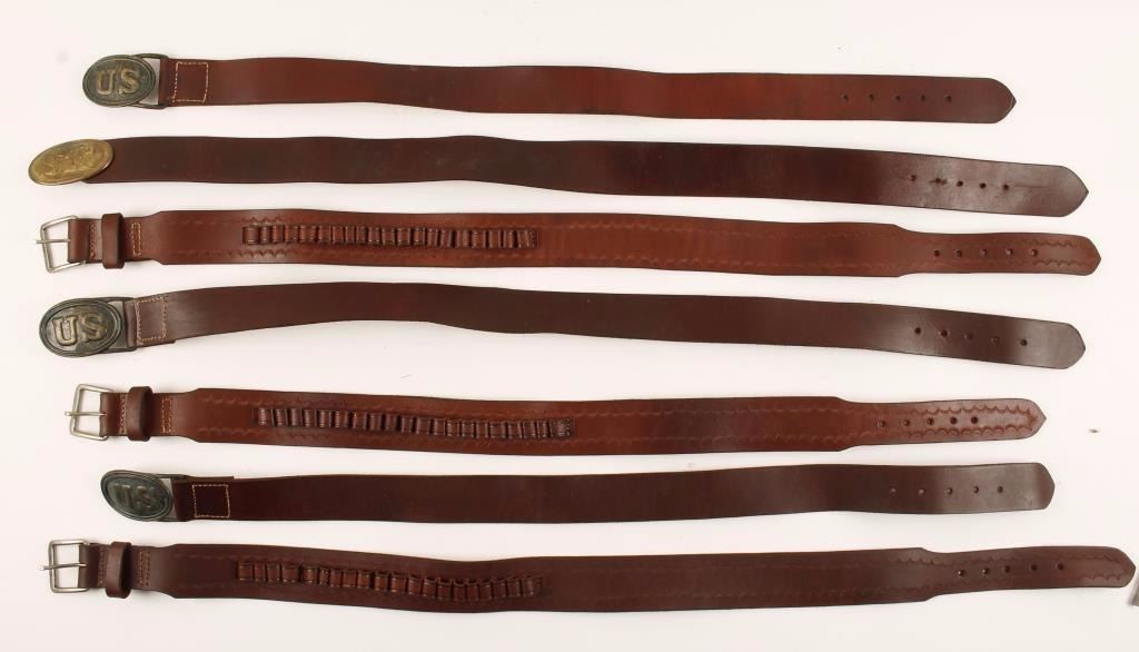 Some with cartridge loops, all brown leather. 4 have "US" belt buckles