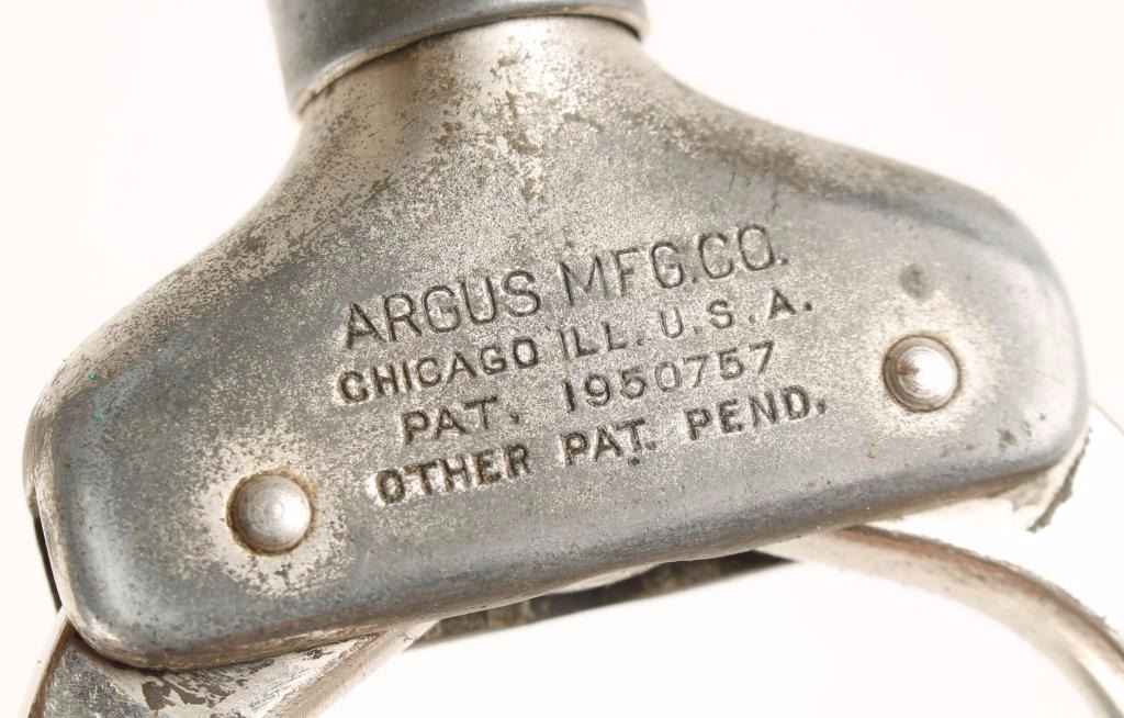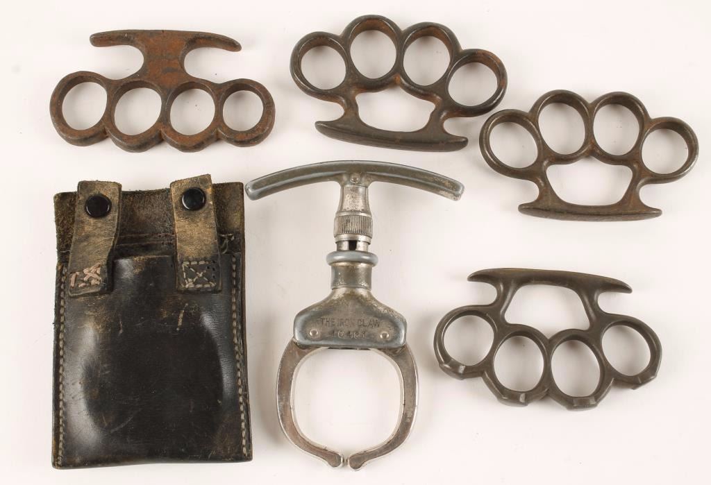 4 pairs brass knuckles and an Argus Mfg Co. 'The Iron Claw" comealong which includes a smooth black leather holster.