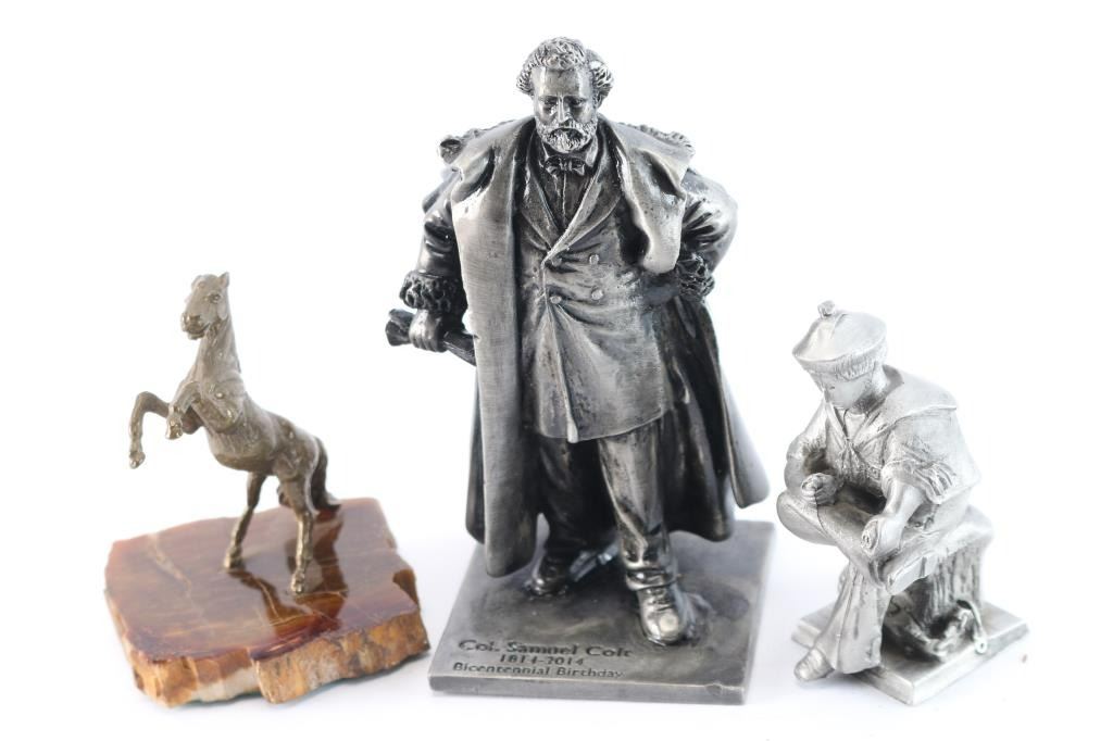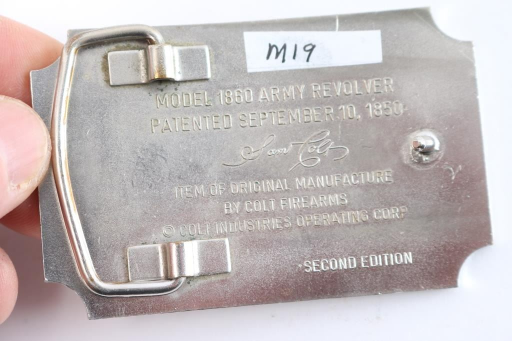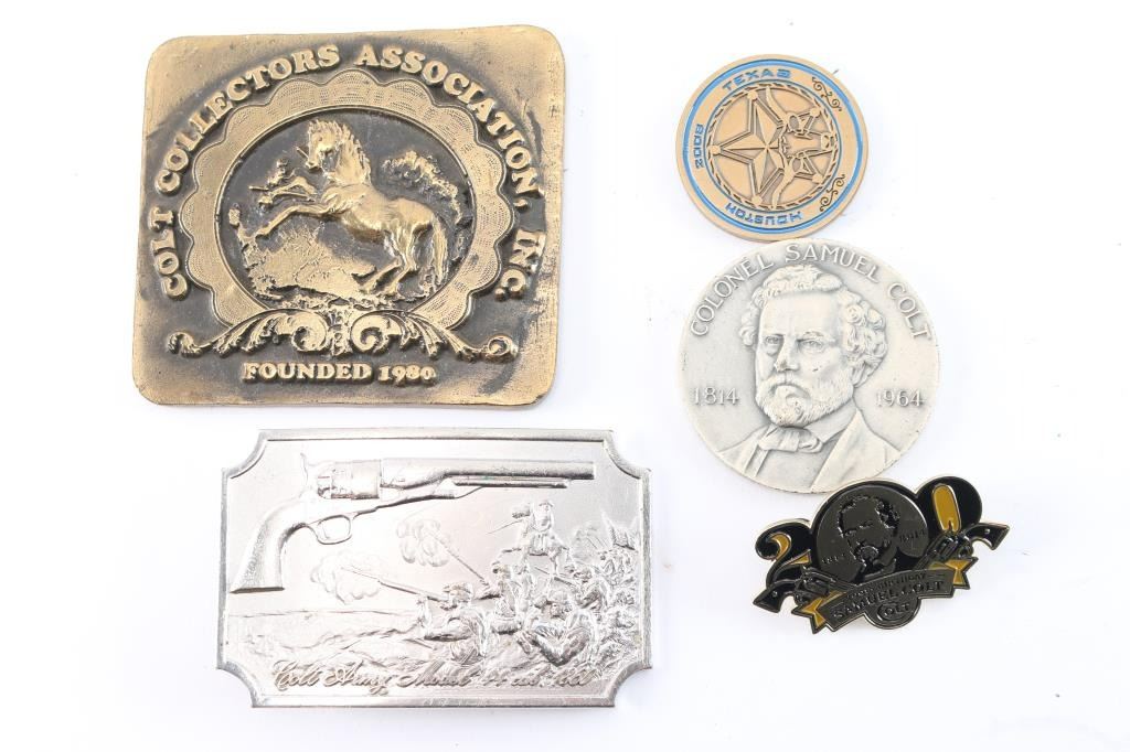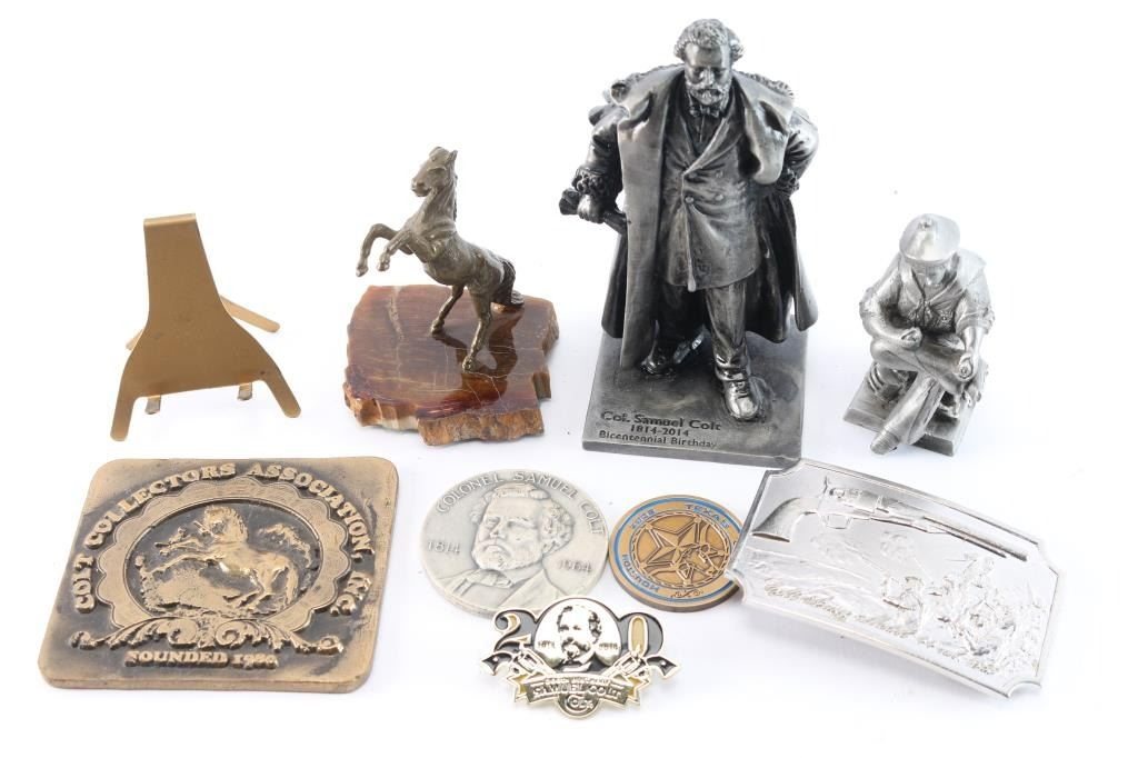 1. Colt collectors 35th anniversary pewter statual of Samuel Colt. 2. Brass Colt collector's plaque. 3. Small brass Rampant Colt on petrified wood or stone. 4. Sam Colt pewter 20th anniversary 1989. 5. 1860 Army belt buckle. Colt marked, 2nd edition, silver color metal in box. 6. Blue and gold Colt ink pen. 7. Sesquicentennial medallion for 125th anniversary Colt revolver box. 8. Colt collector's medallion, Houston 2008. 9. 125th anniversary key chain medallion for Samuel Colt. 10. Samuel Colt pin. 2013, by Hogeye.