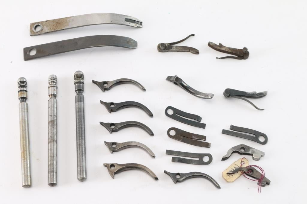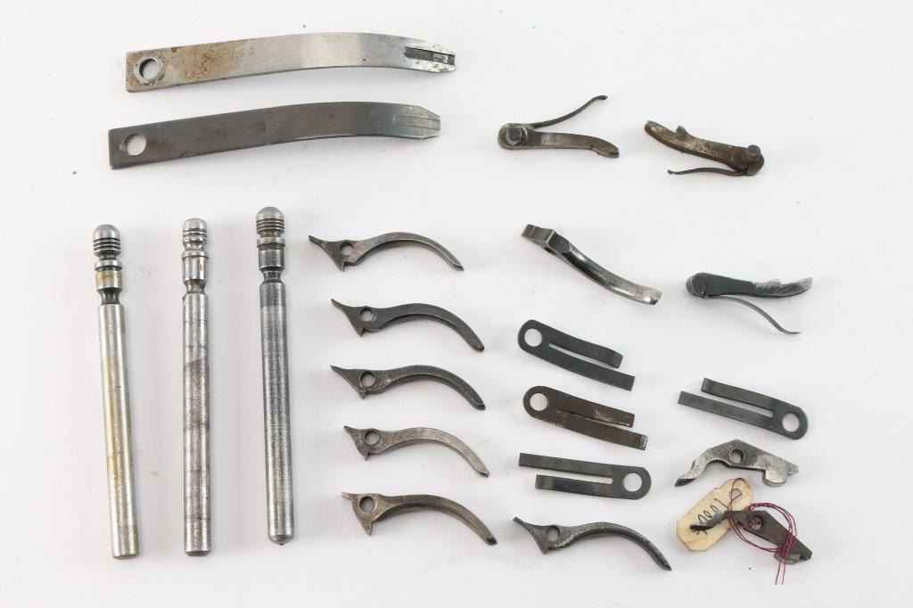 A. 8 triggers. 5 appear excellent to new, 2 used. B. 4 bolt springs. 2 new, 2 used. C. 2 used cylinder latch, 3 repro cylinder pins. D. 2 main springs, 1 new, 1 used. E. 3 hand assembly's, used but fine. John Kopec estate collection.