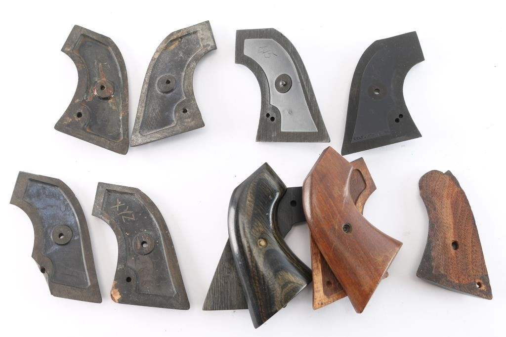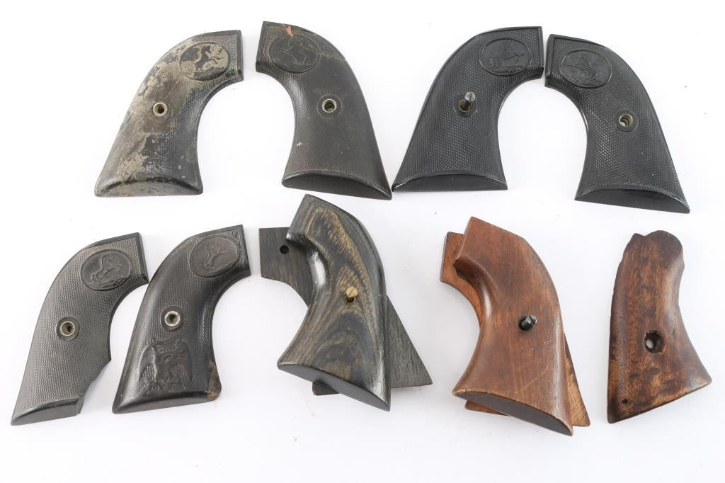 1. Poor pair of Colt S.A.A. grips (1st Gen). 2. 1 composite pair for 2nd to 4th Gen. S.A.A. 3. Older pair of Colt S.A.A. wood grips 25-50 years old. 4. 3 loose singl3 grips. Hard rubber eagle - poor with chips to toe missing. 5. 1st Gen - good other than severe chip. 6. Single wood percussion grip no esctucheon. Navy or Whitney. 7. Late 3rd or 4th Gen grips for Colt S.A.A. #315 on interior. Near fine condition.