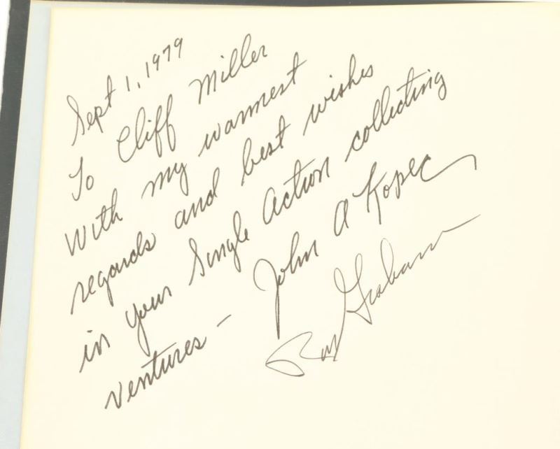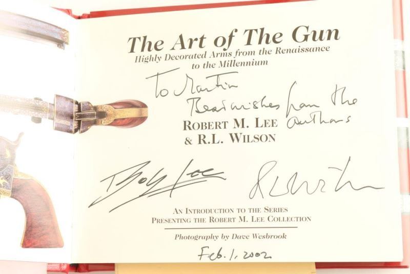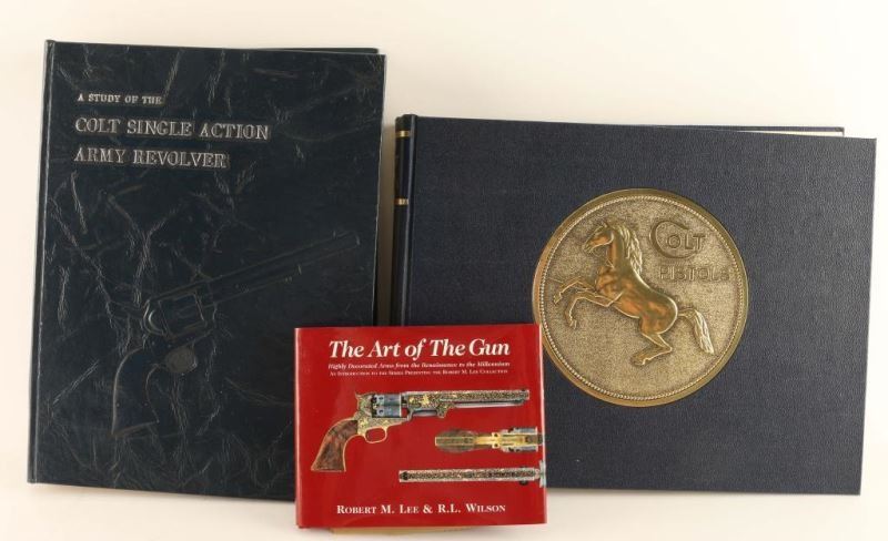 "The Art of the Gun" by Robert M. Lee & R.L. Wilson-signed by authors, "A Study of the Colt Single Action Army Revolver" by John A. Kopec-signed by author, and "Colt Pistols" by R.L. Wilson and R.E. Hable in cardboard dust jacket with Colt medallion emobossed on front of book.
