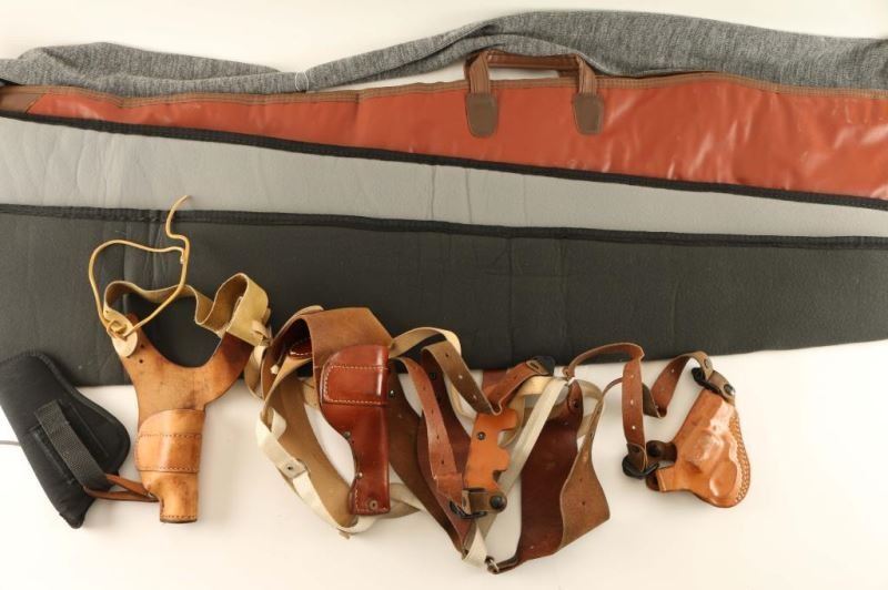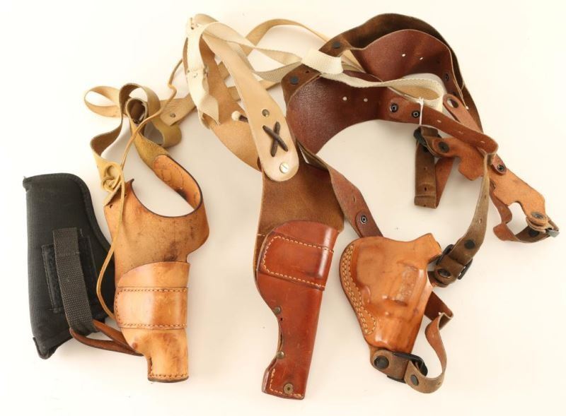 Three shoulder rigs plus one webbing holster and four gun boots.