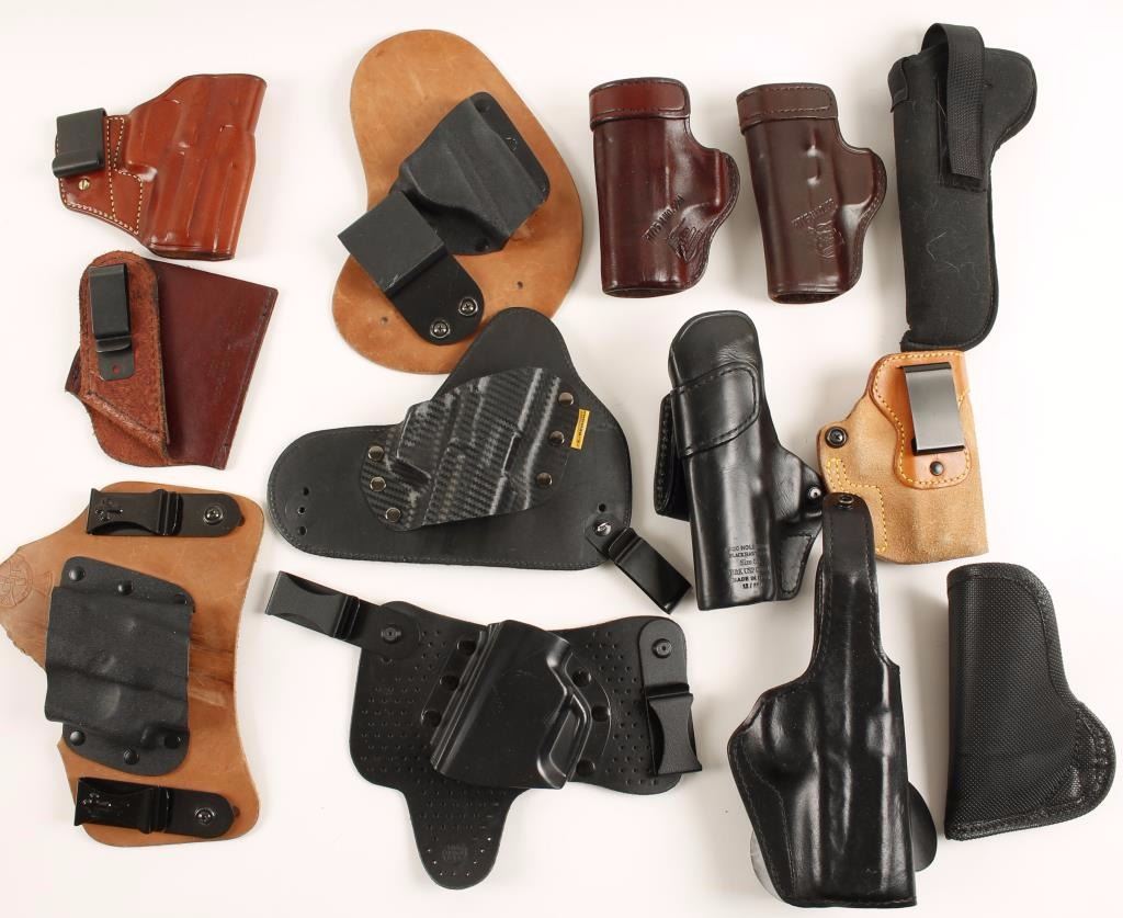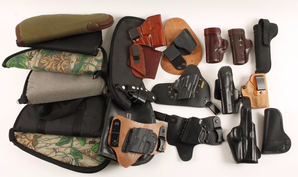 Leather, metal and rubber holsters in various sizes and 8 handgun rugs.