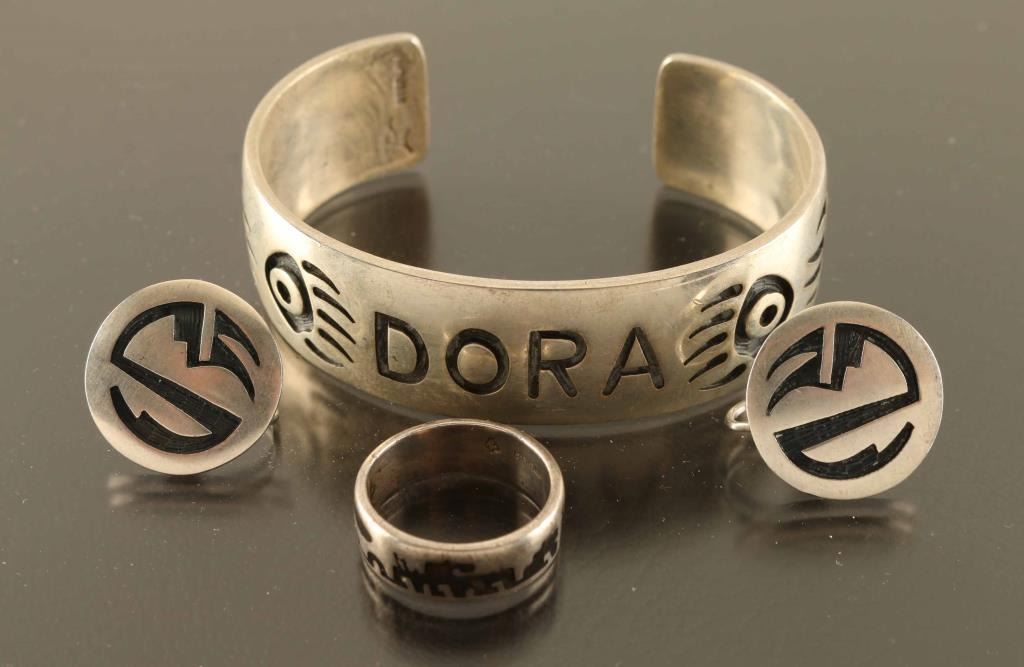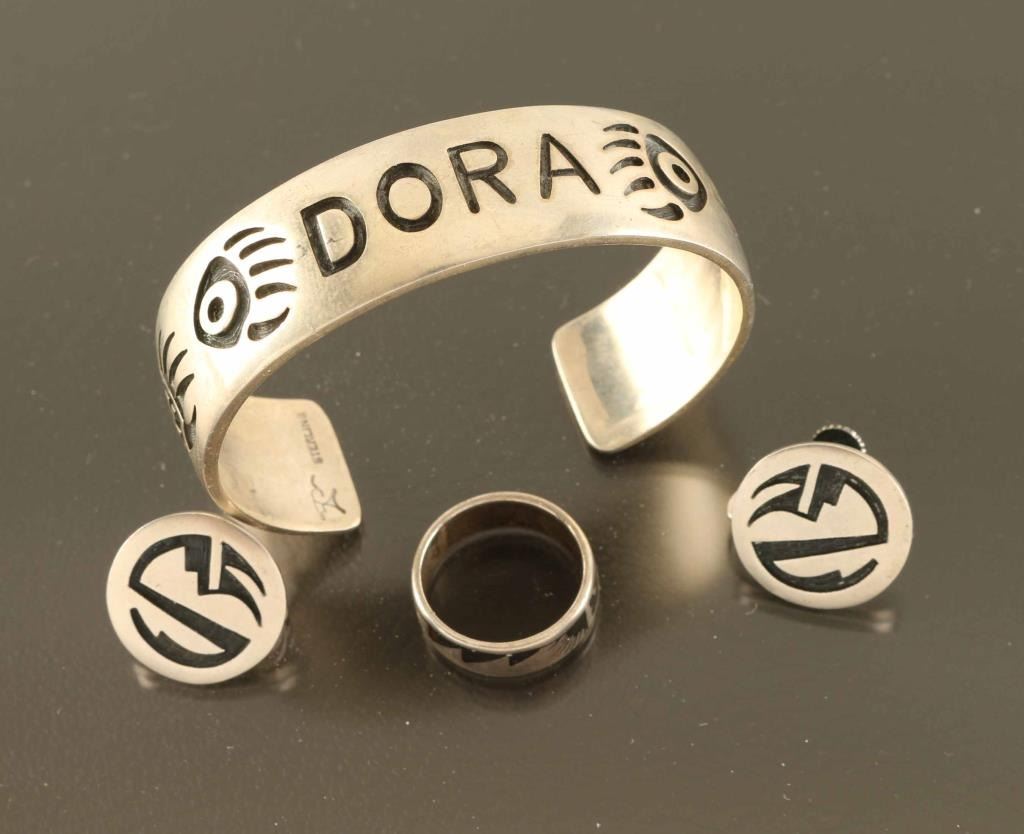 (1) Sterling Cuff Bracelet engraved "DORA" (1) Sterling screw on earrings (1) Sterling Ring All made and marked by Edward Lomahongva