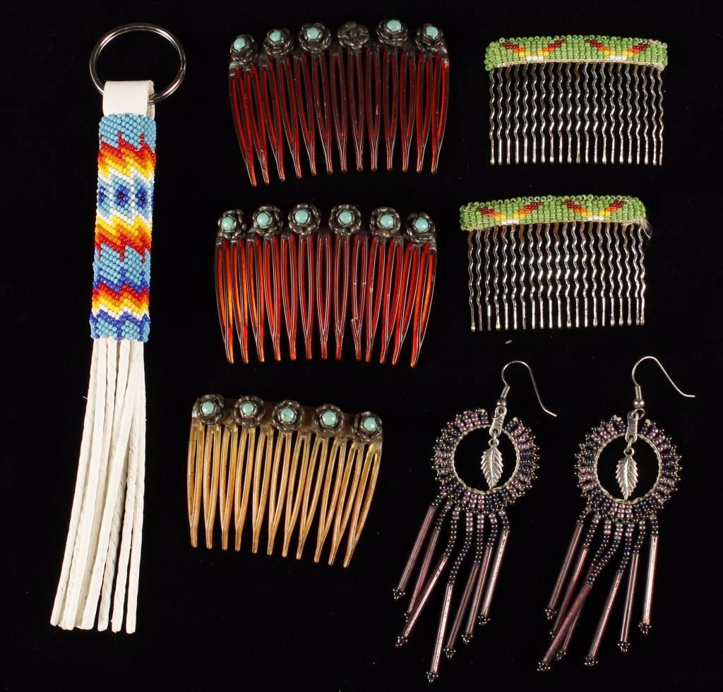 3 Sets of hair combs, a pair of earrings and a beaded keychain.