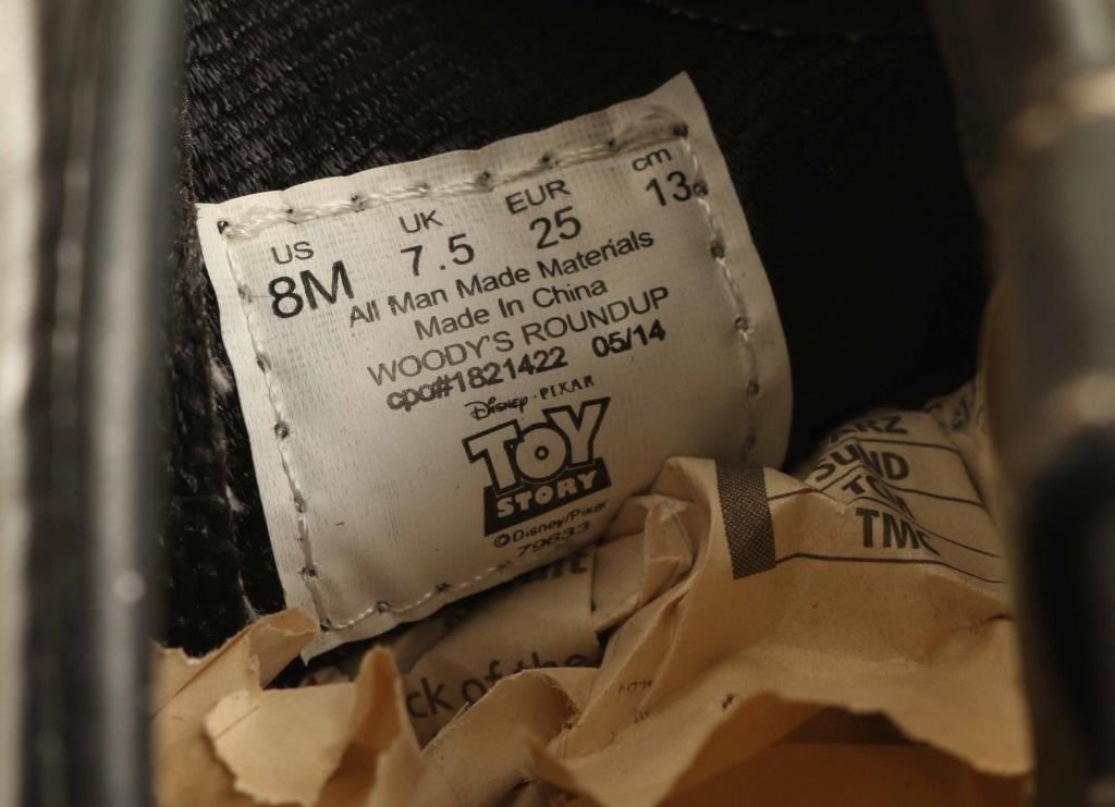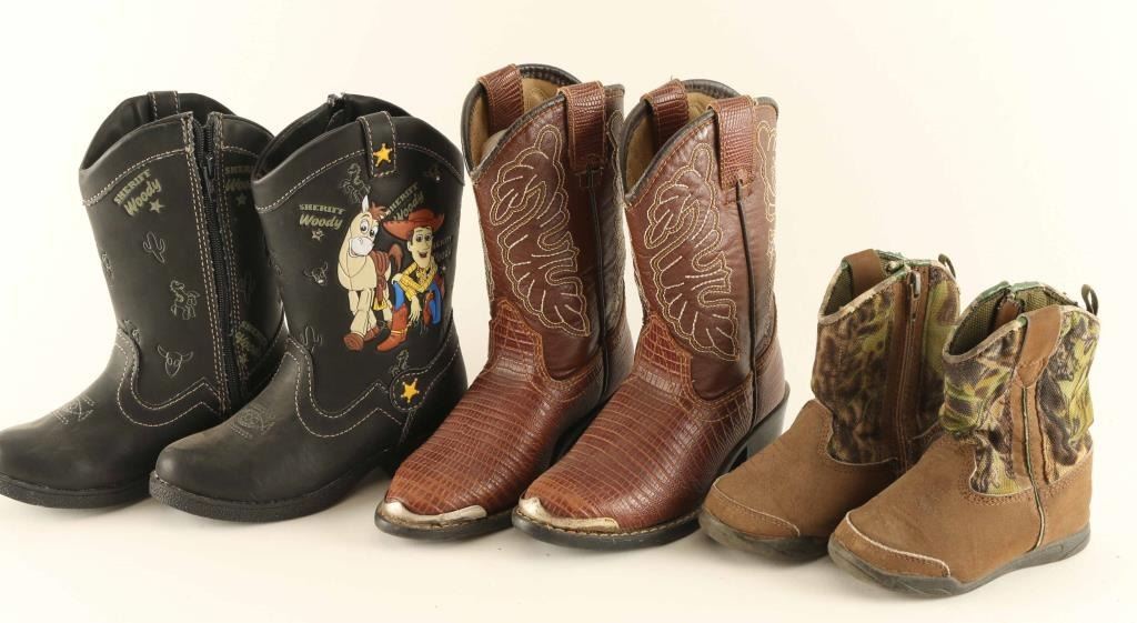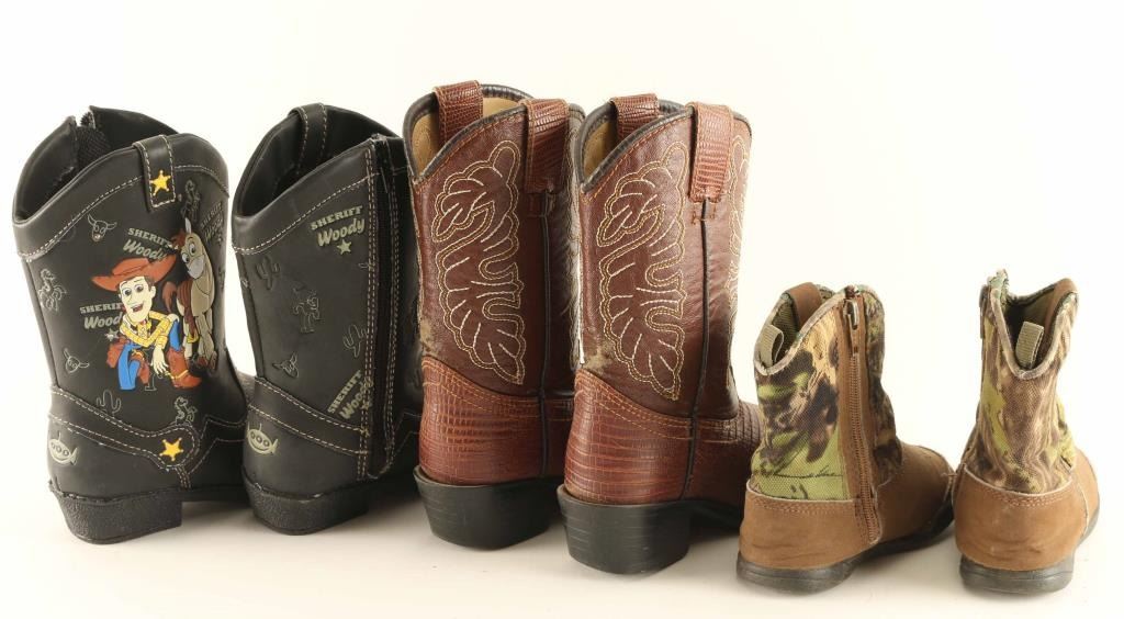 Includes (3) pairs of boots including a beautiful pair of crocodile leather boots with a stitched pattern on the top, a rubber Toy Story themed pair, and woodland camo colored pair. All in very good to good condition.