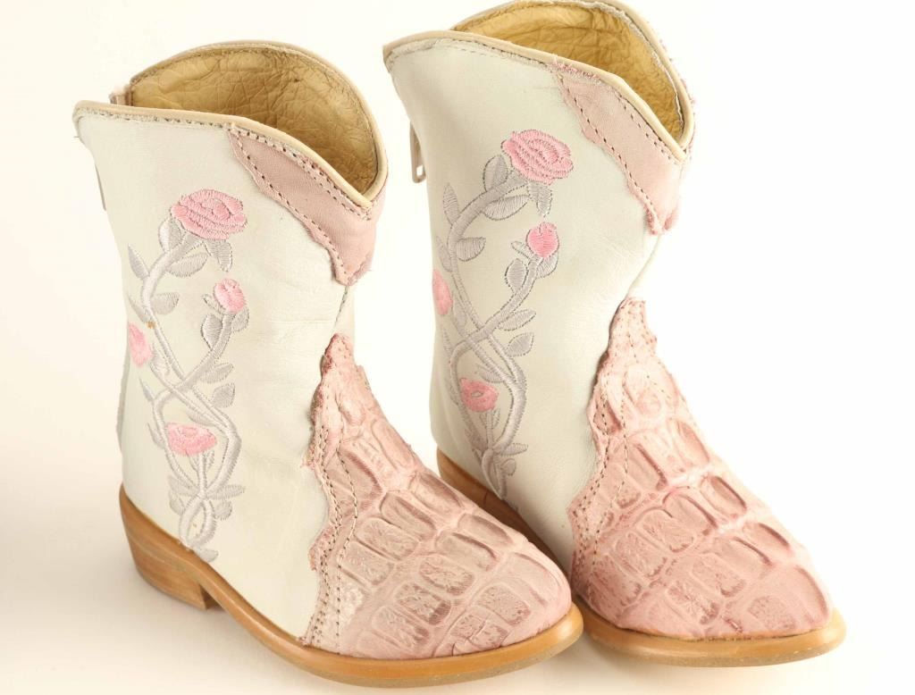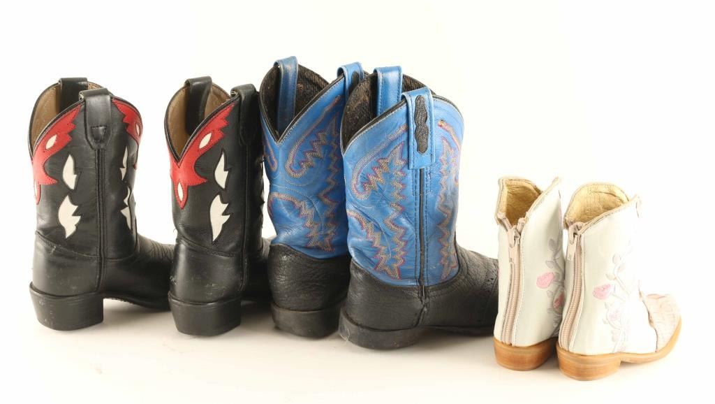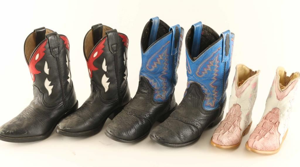 Includes (3) pairs of boots including pink dyed faux alligator with embroidered rose design, black and blue dyed leather with stitched design, and black with white and red accents. All in very good to good condition.