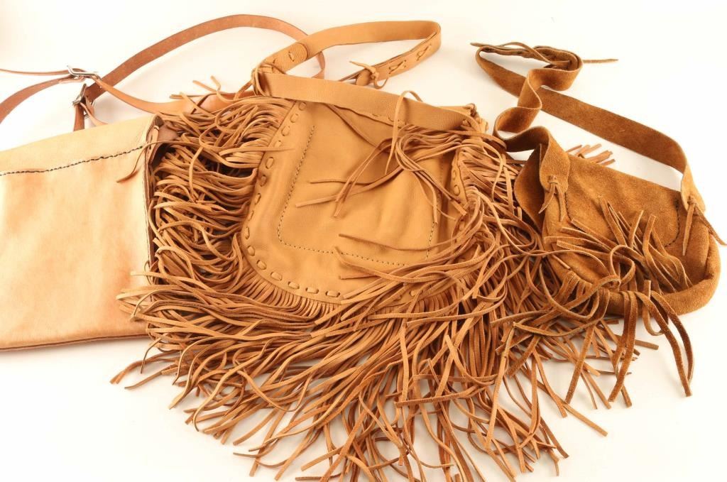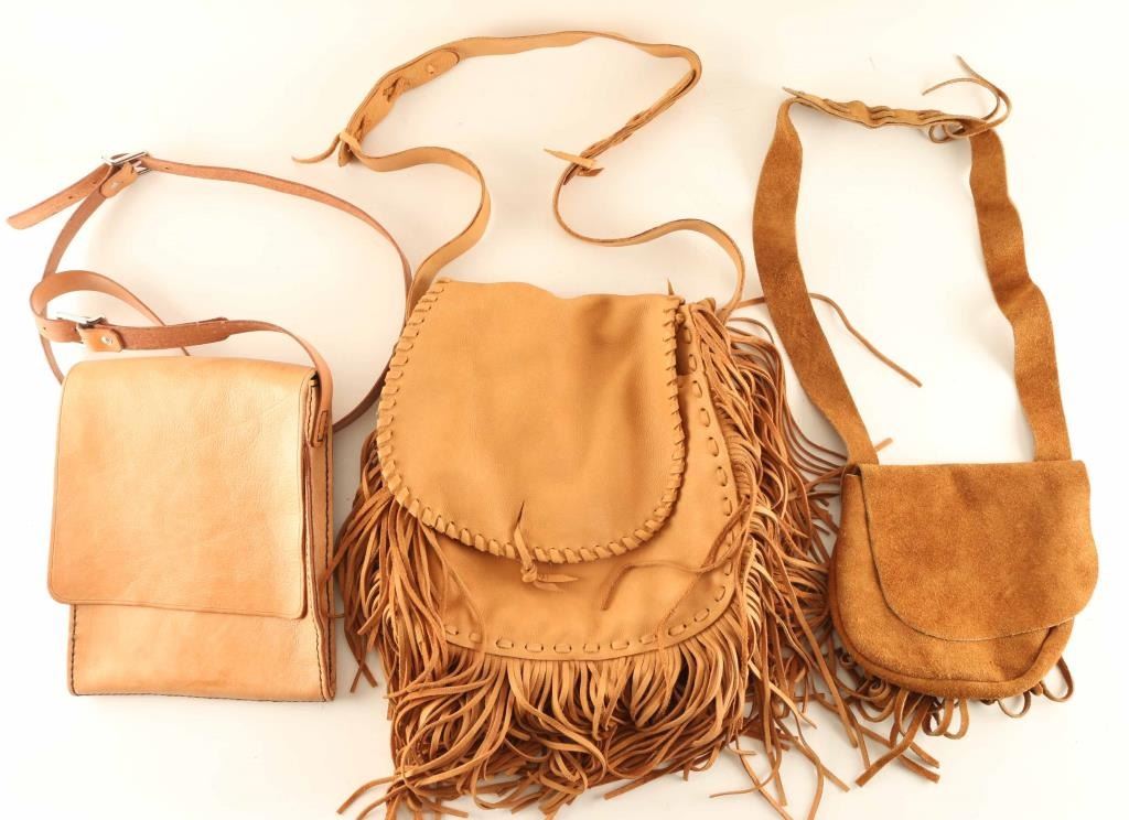 Lot includes (1) Messenger/Man Bag with One outer compartment and two under a leather flap, (1) Small Leather Shoulder Bag with one smaller pocket and a larger pocket; this bag is decorated with fringe leather, and (1) Large Fringe bag with two large compartments with one containing two smaller sized pockets. All items are genuine leather from Arizona leathersmith Bill Myers.