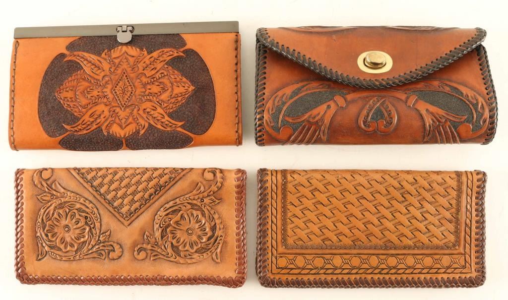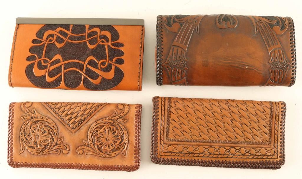 Includes (2) Leather Roper Wallets, (2) Leather clutch purses. Lot also includes (2) Magnetic Money clips.