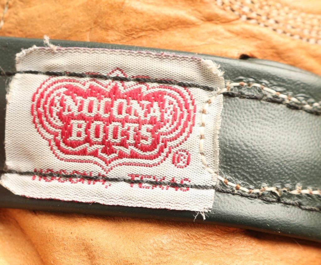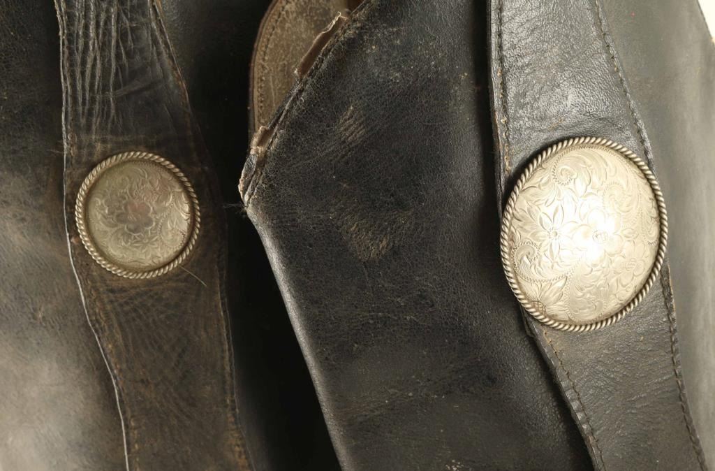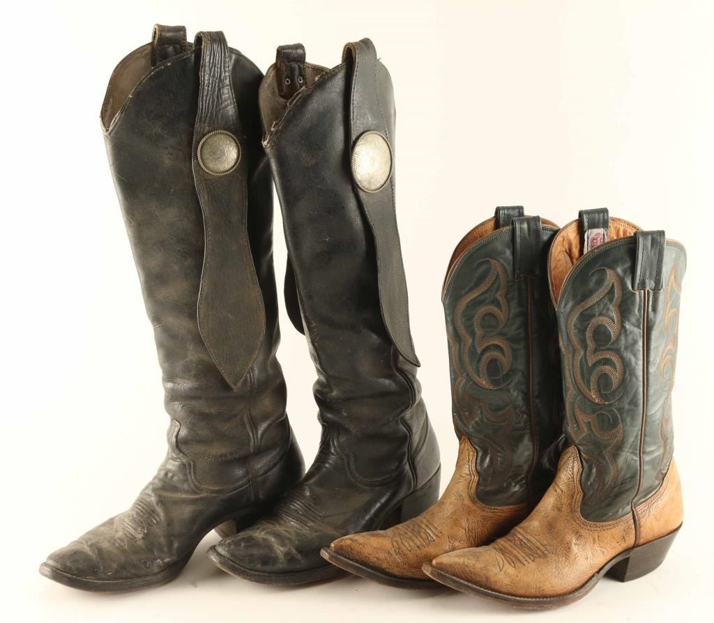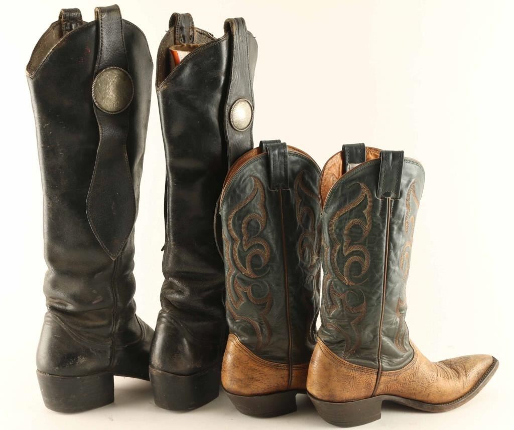 Includes (2) pairs, (1) is a tall black leather boot decorated with floral conchos on either side in good condition, and (1) pair of tan and black leather boots with wonderful stitch work on the upper, in good condition.