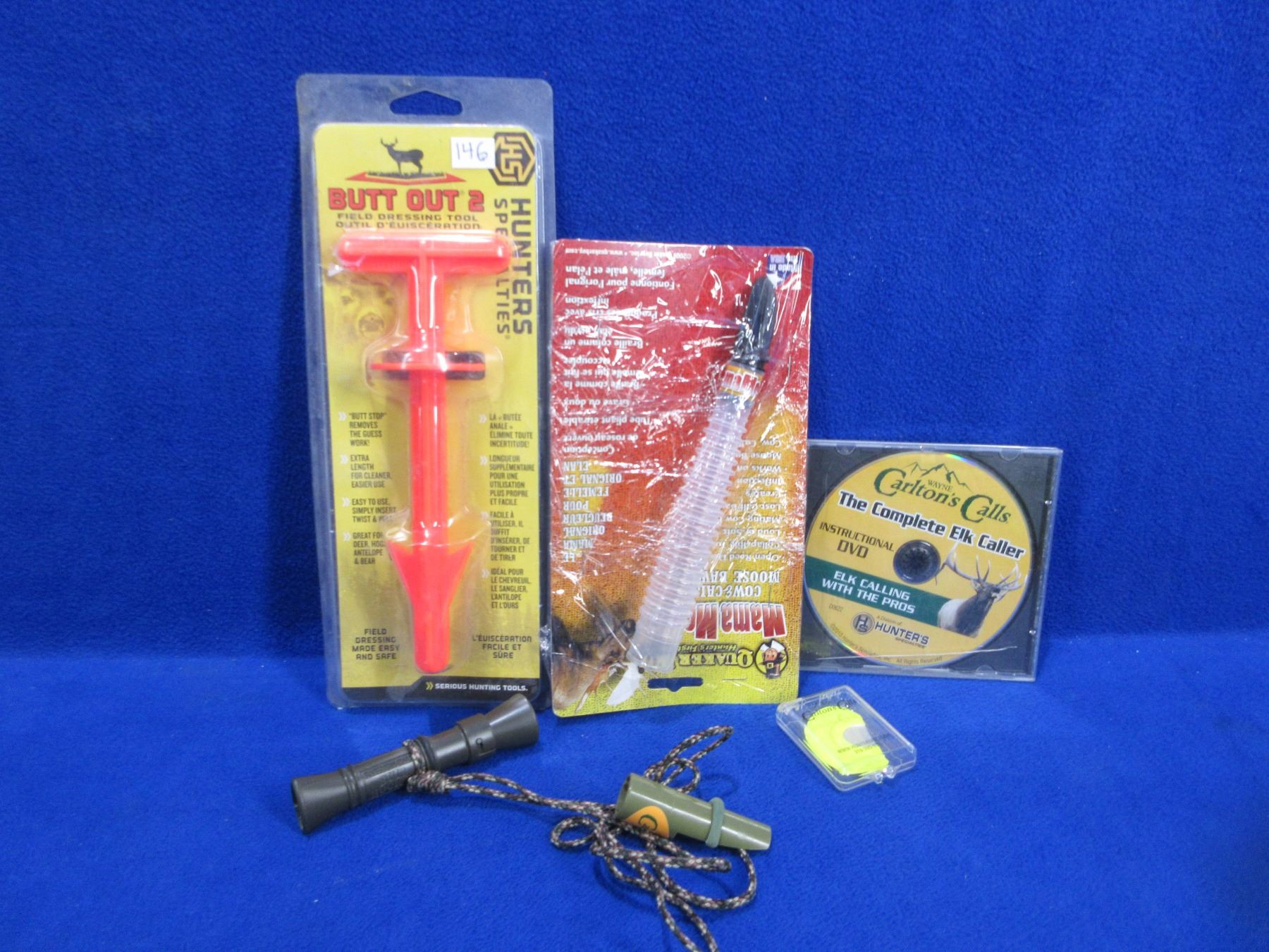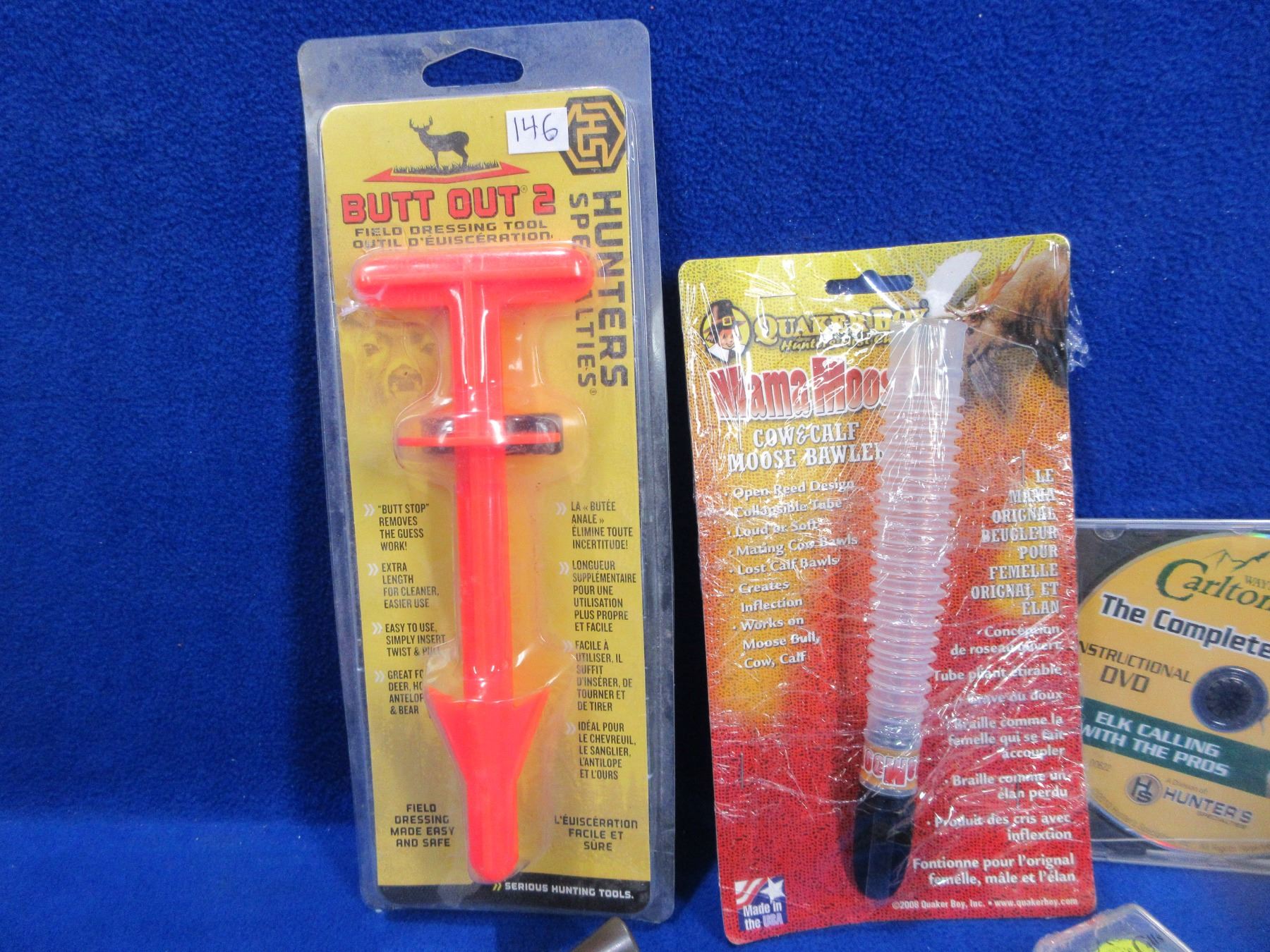 Lot of Misc. - 4 Game Calls, Elk Call DVD and Butt Out 2 Field Dressing Tool