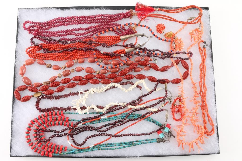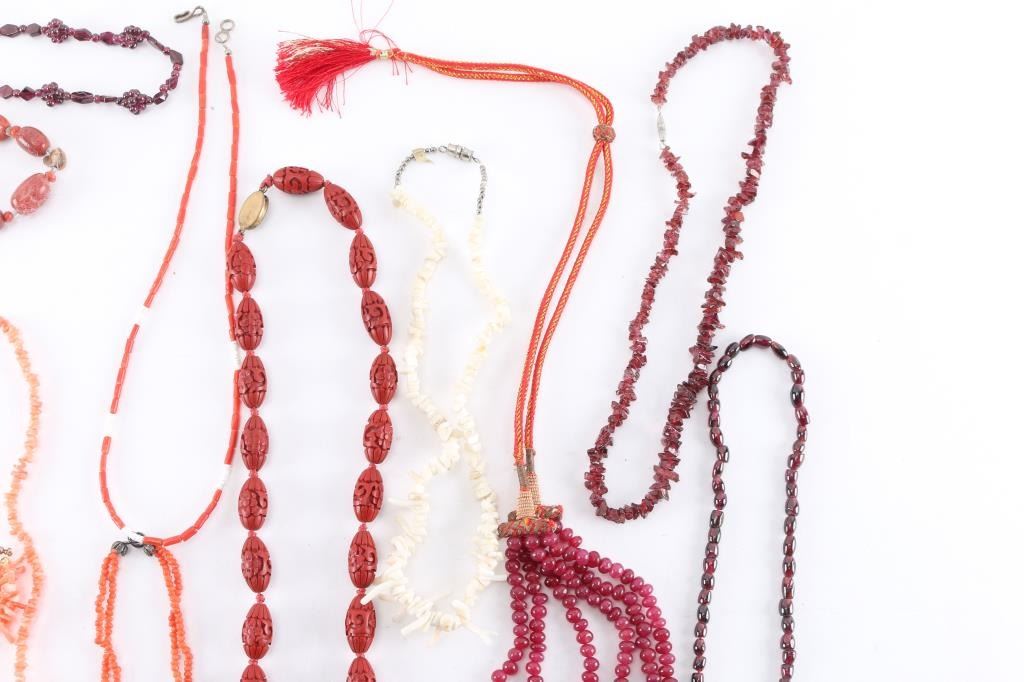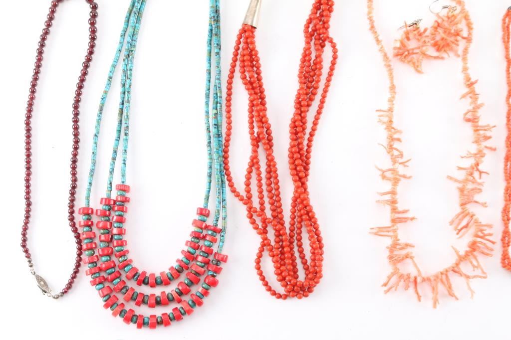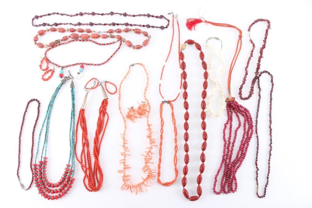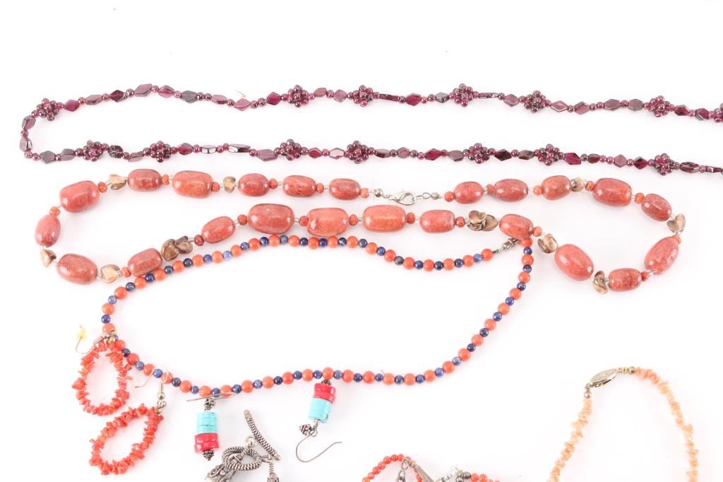 Miscellaneous single and multi-strand necklaces and earrings, including some coral, garnet, turquoise and other.
