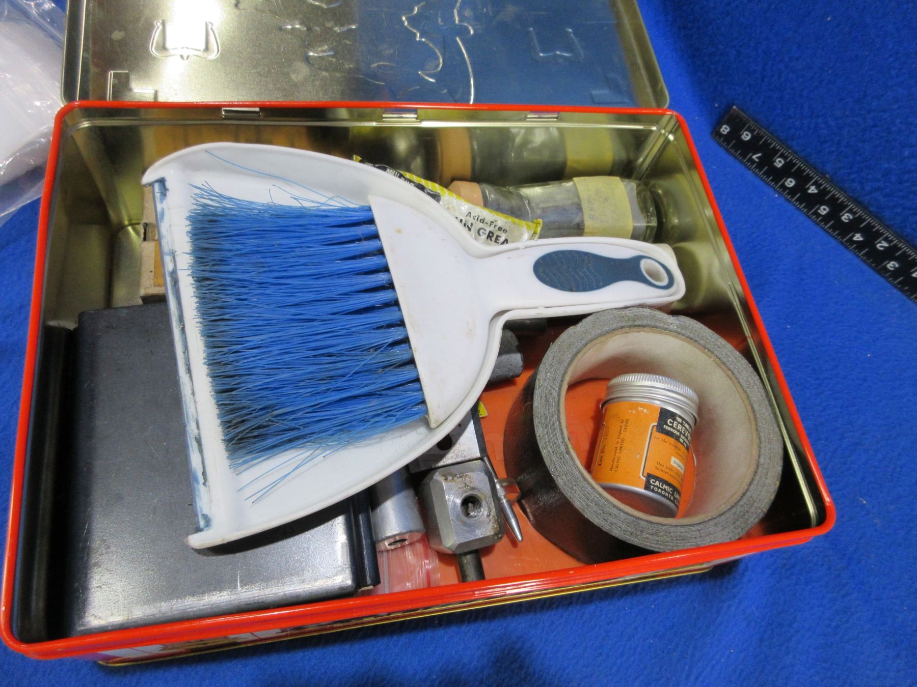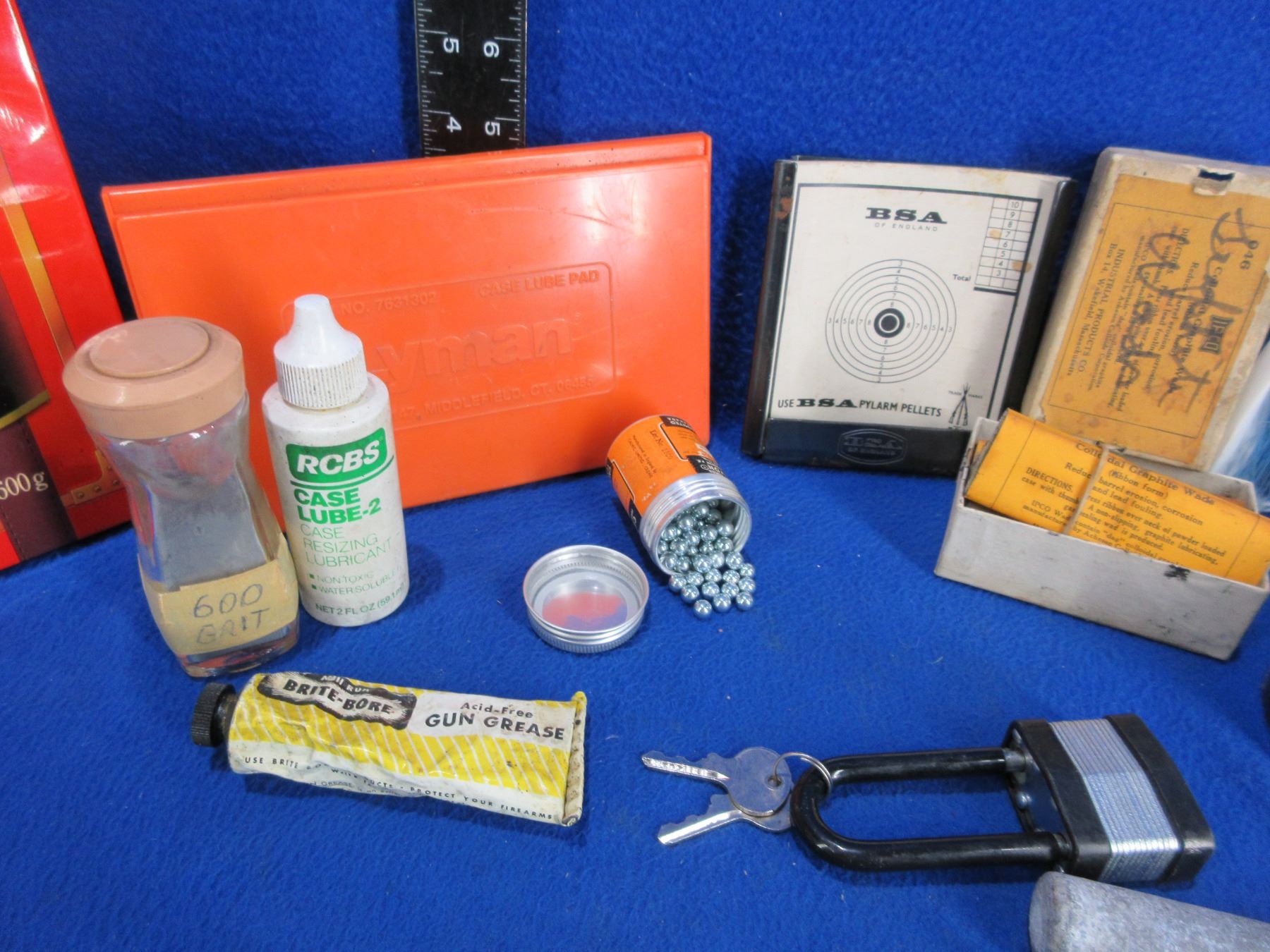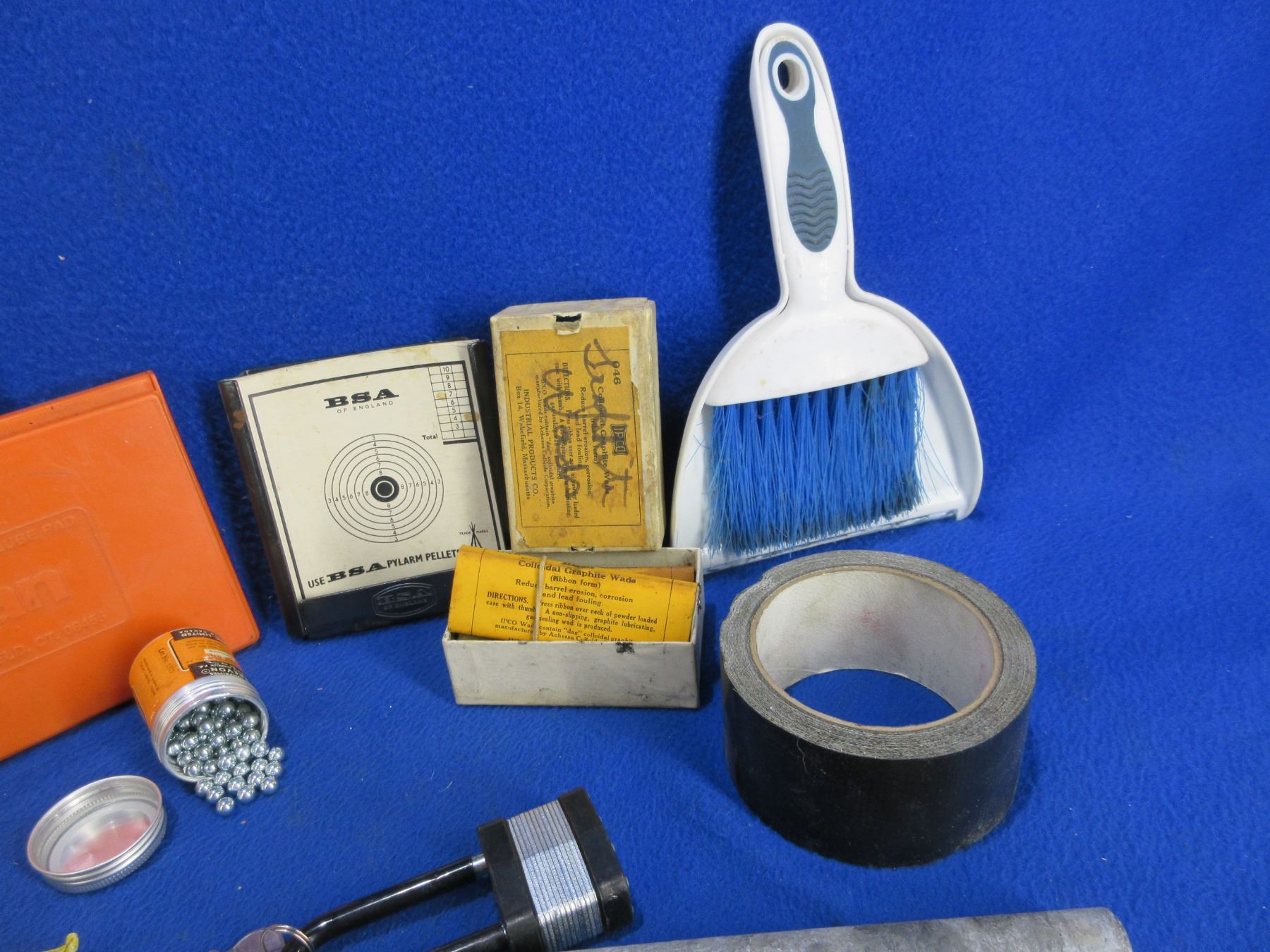 Lot of Misc. Gun Tools, Supplies, Fishing, Etc. - Case Lube Pad, Duct Tape, Brush and Dust Pan, BB's, Target Holder, Padlock, Silicon Carbide 600 Grit, Fishing Weights, Etc.