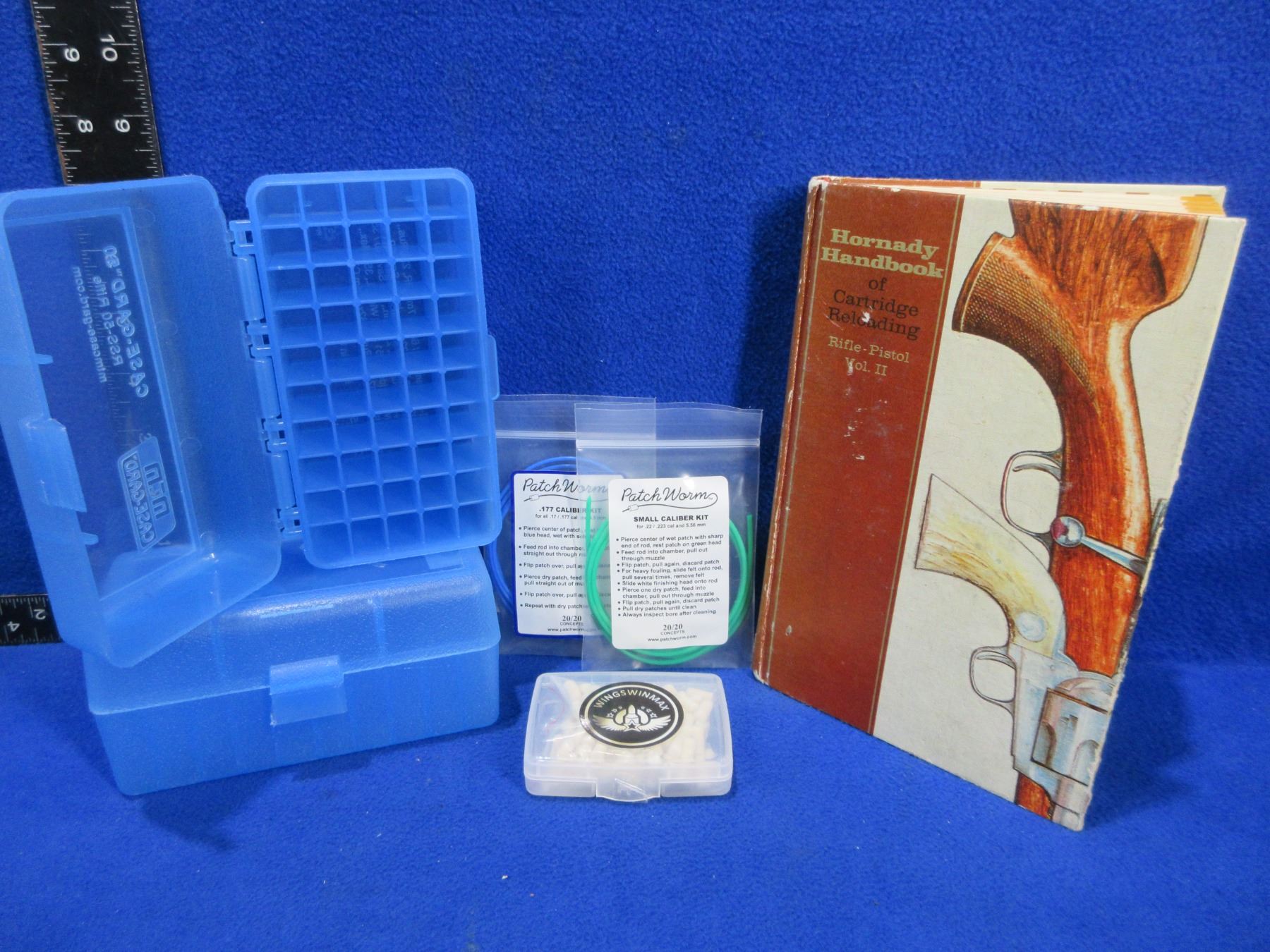 Lot of Misc. - Hornady Reloading Book Rifle/Pistol Vol. 2, 2 MTM Cases, 2 Patch Worms (177 Cal. and .22 Cal.), Etc.