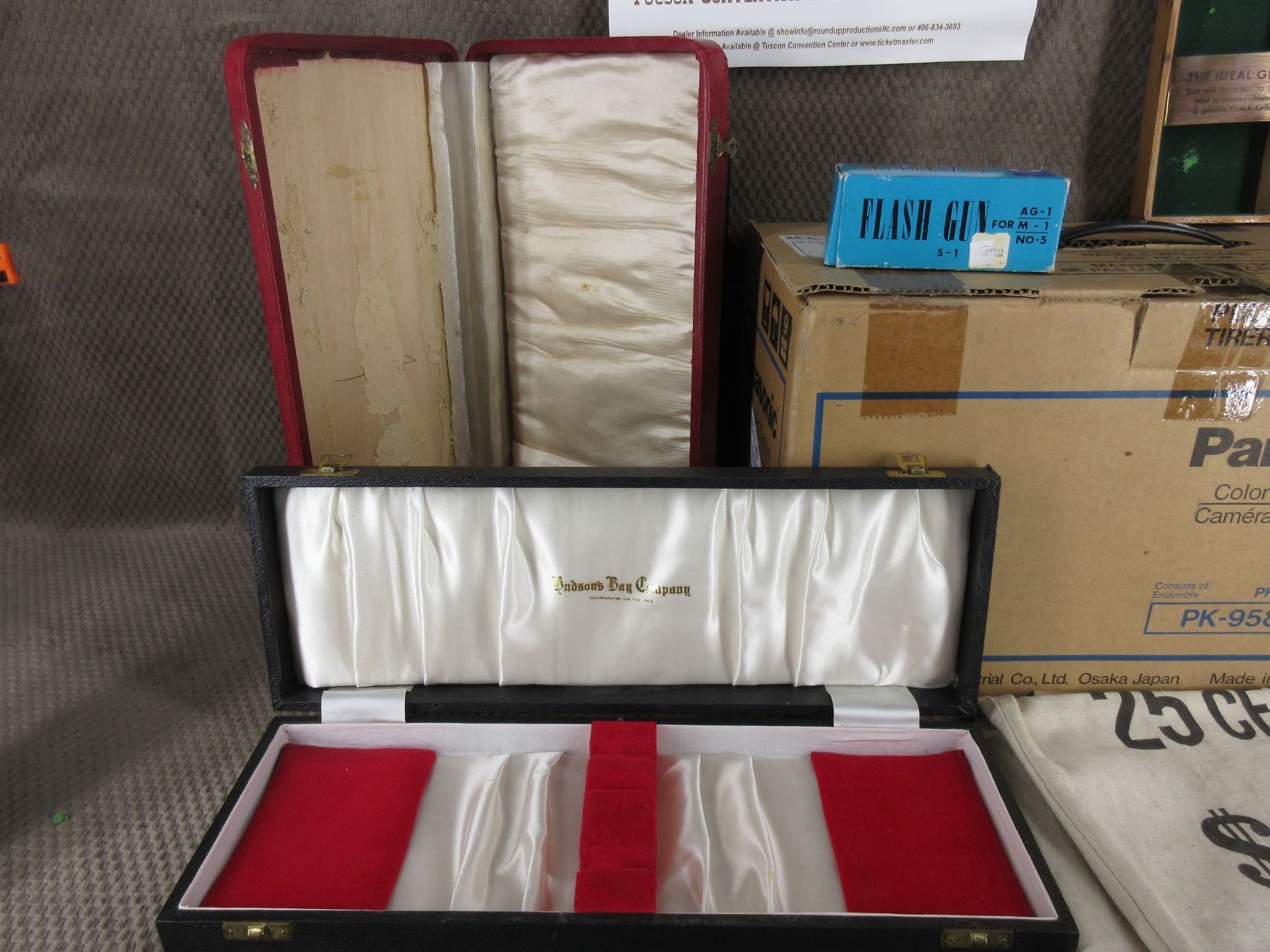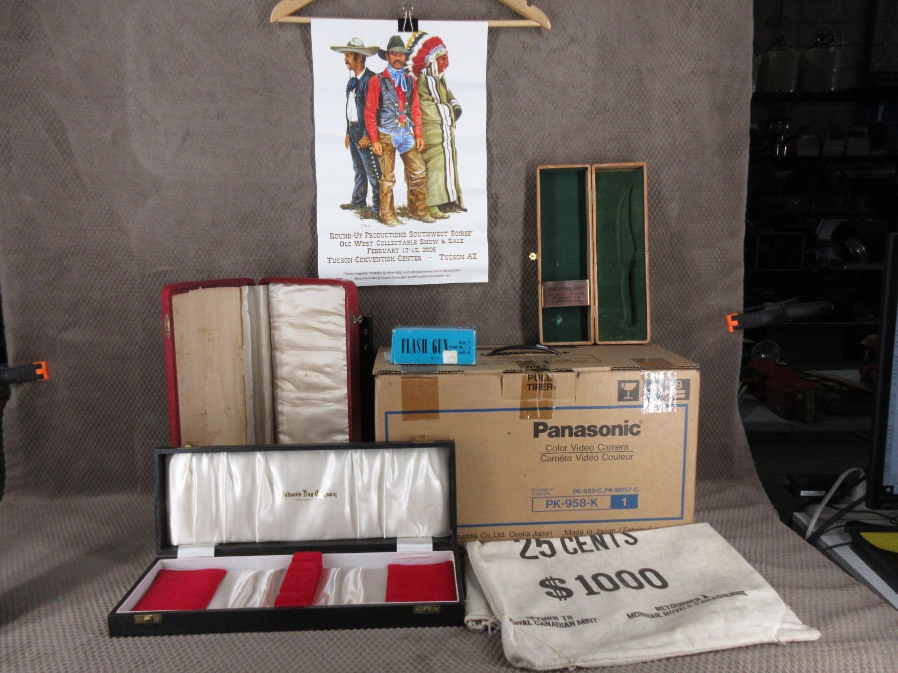 Lot of Misc. - Vintage Panasonic PK-958-K Color Video Camera, 3 - Vintage Boxes, Tucson Show & Sale Picture, Coin Bag, Vintage Sabre Flash Gun for Photos