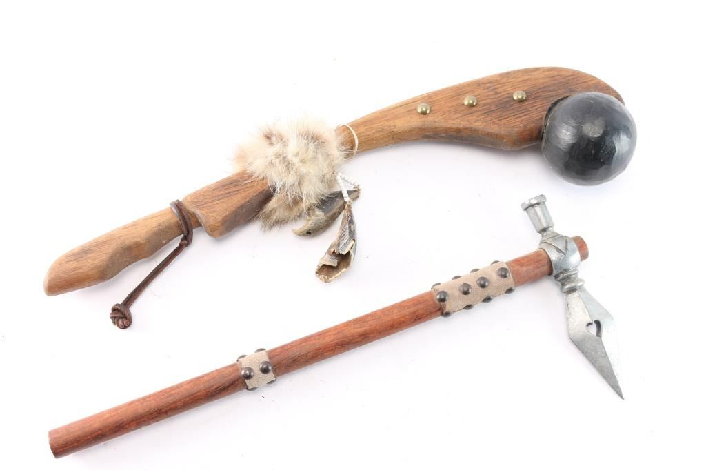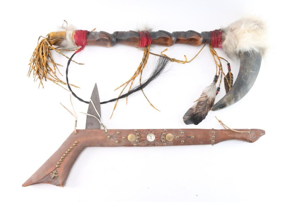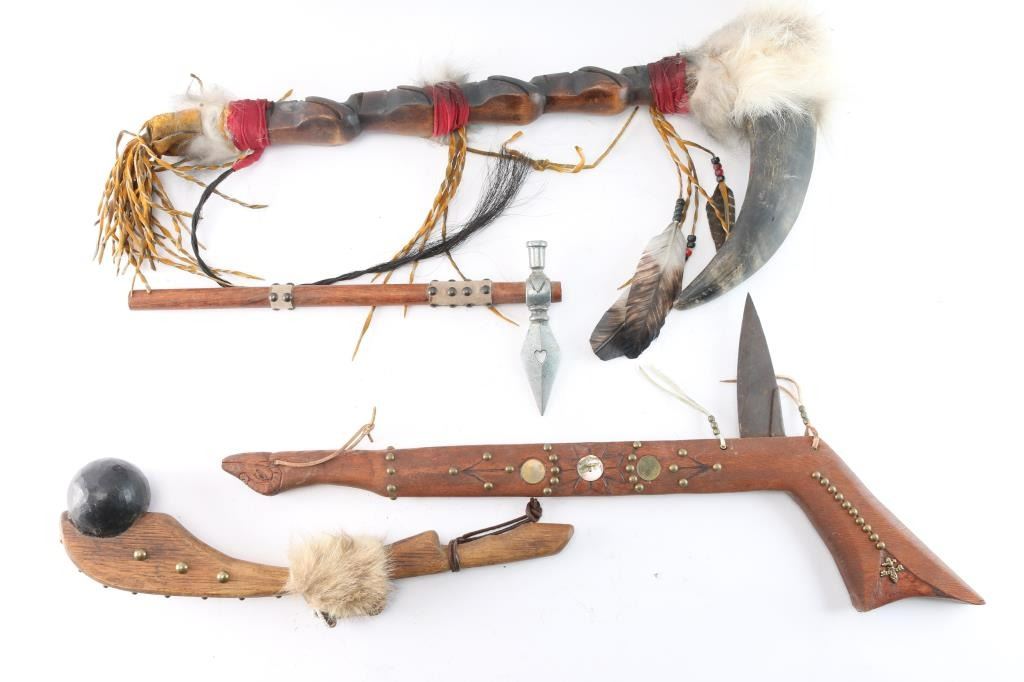 Includes: (1) Wooden club with brass tacks, fur, and hooves. (1) Bull horn club with wood handle with fur, feathers, and twisted leather. (1) Gunstock war club with spike, brass tacks and shell inlay. (1) Replica tomahawk with leather and brass tacks.