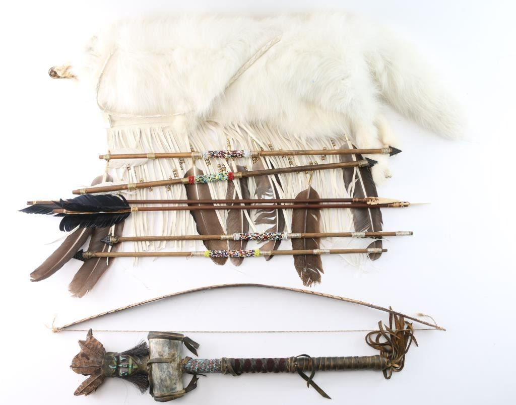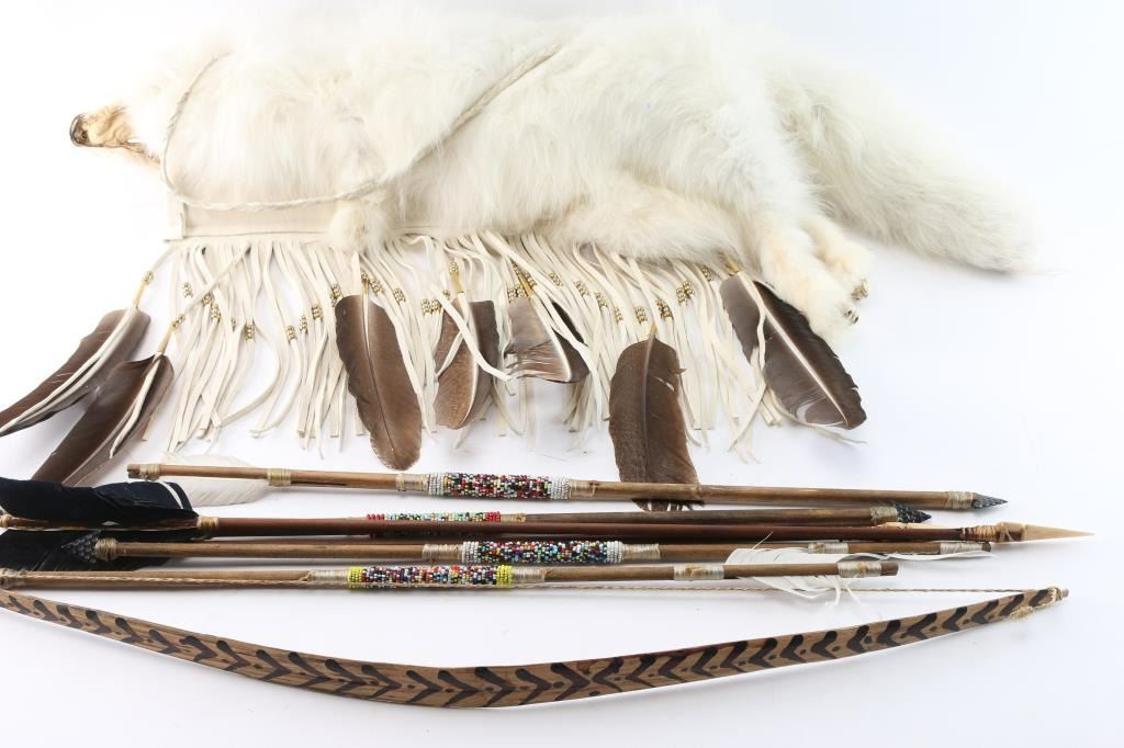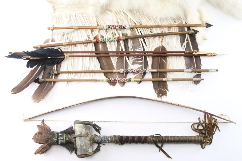 Includes: Bow with 2 beaded arrows, Navajo horn rattle with leather wrapped handle, quiver made of white fur with 4 arrows.