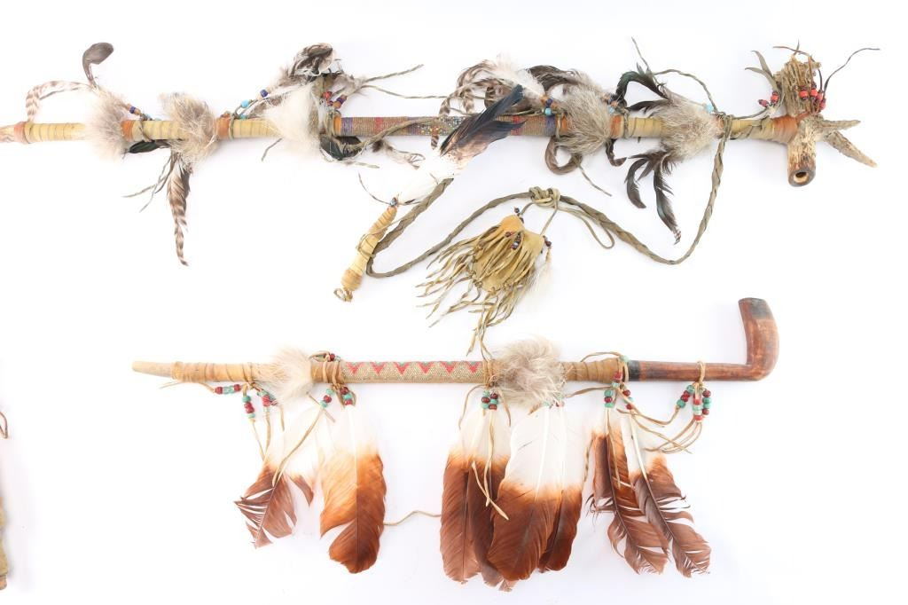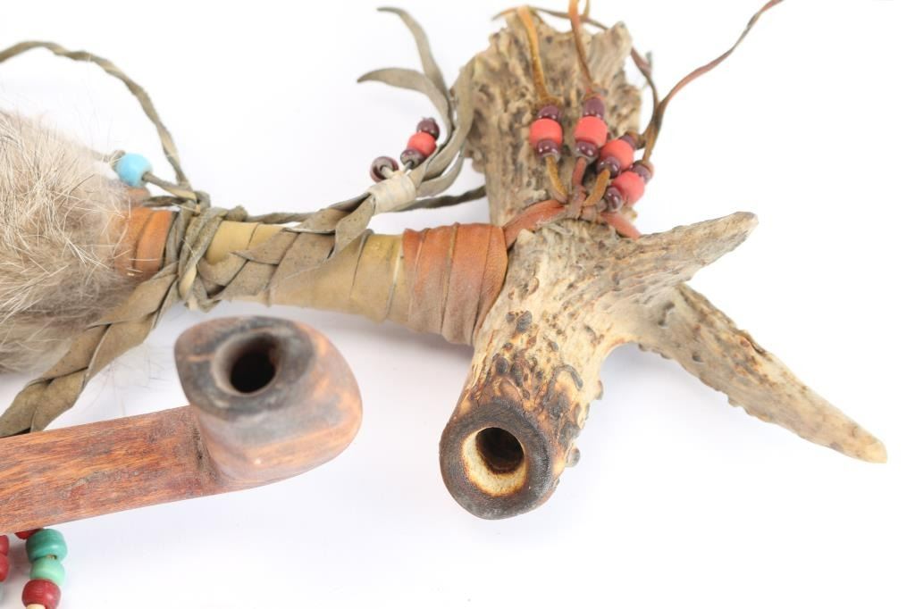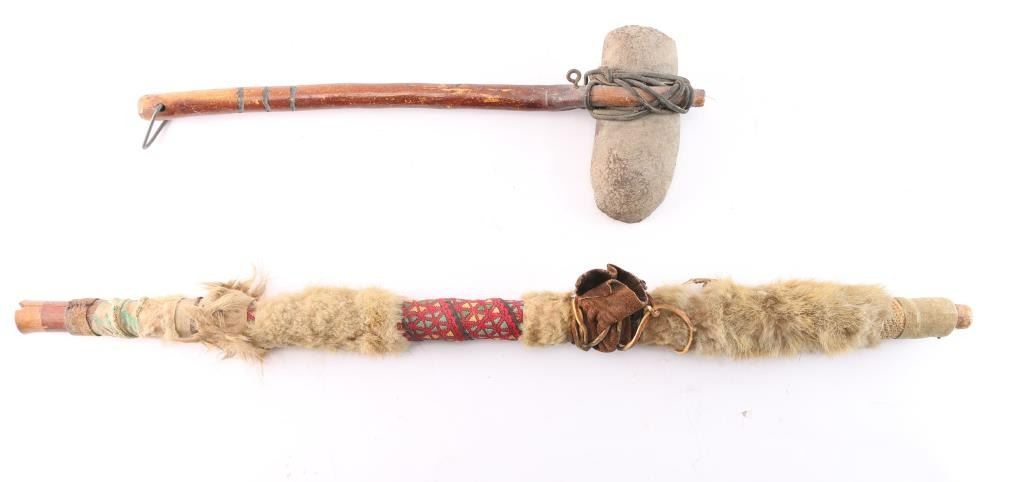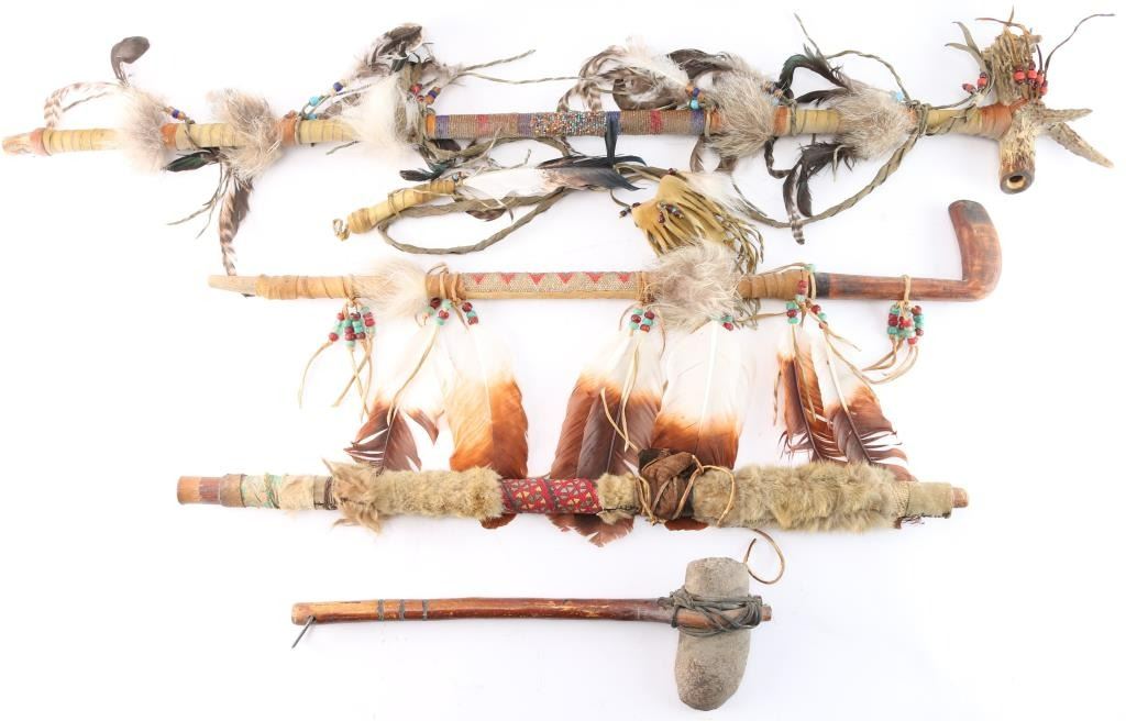Includes 4 items: (1) Wooden Peace pipe wrapped in leather with diamond beadwork and feathers. (1) Antler Peace pipe, wrapped in leather with red and blue beaded rings and with feathers and leather pouch. (1) Stone club with leather wrap. (1) Peace pipe wrapped in fur and textile, missing bowl.