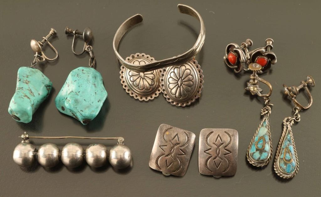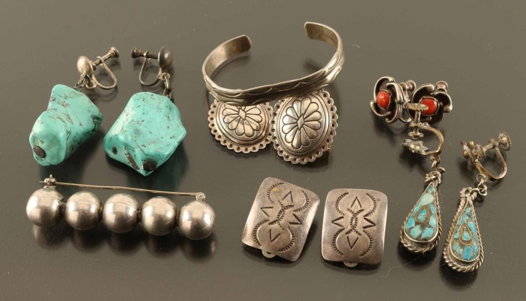 (3) Pairs of Zuni clip on earrings (1) Sterling baby bracelet (1) Mexican sterling pin (1) Concho clip-ons (1) Faux turquoise clip-ons
