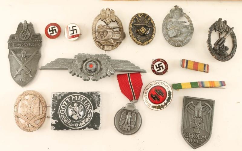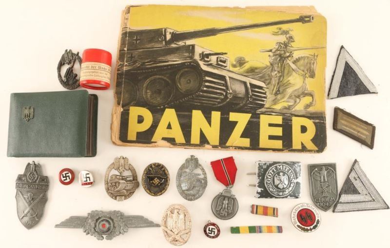 Including; patches, pins, belt buckle, ribbons, black & white film showing Nazi WWII related photos, small green photo album with eagle and swastika on front shows B&W photos of soldiers, and a Panzer Magazine.