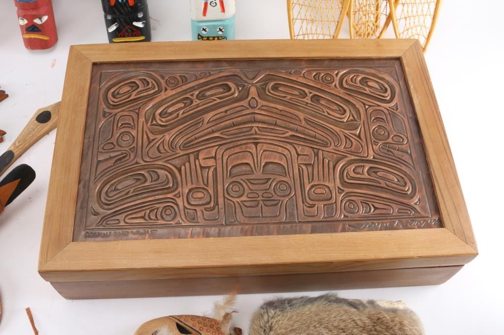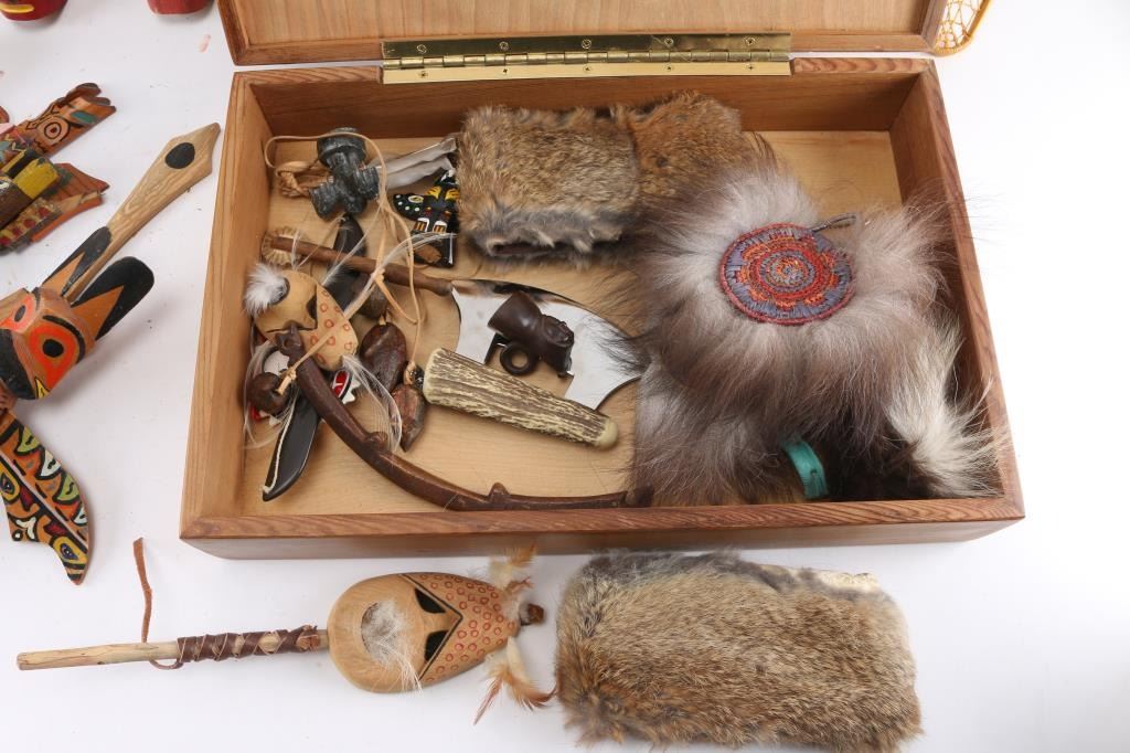 (1) Joseph Illig, Seattle Artist/Designer Recreation of Northwest Coastal Masterworks, copper topped wood box measuring 17 1/2" x 11 3/4", containing 3 fur ankle ties, 2 fur trimmed small weavings, 1 faux antler blade, 2 small carved masks, and other miscellaneous carvings in stone and wood.