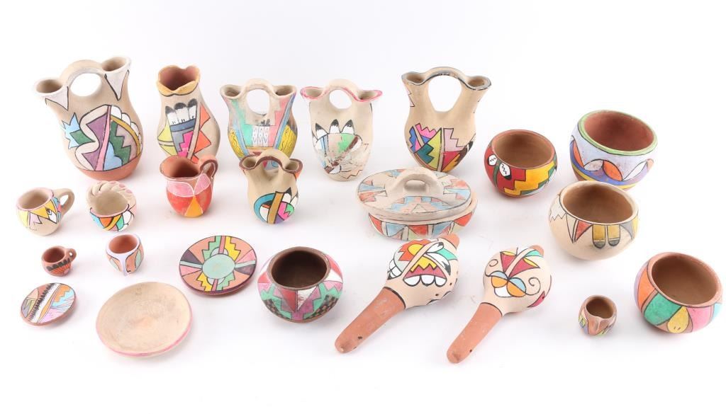 Includes 5 wedding vases, 2 rattles, 1 lidded pot, 1 pitcher, 3 plates, 5 small pots, and others