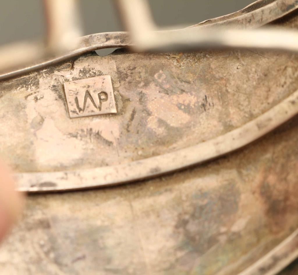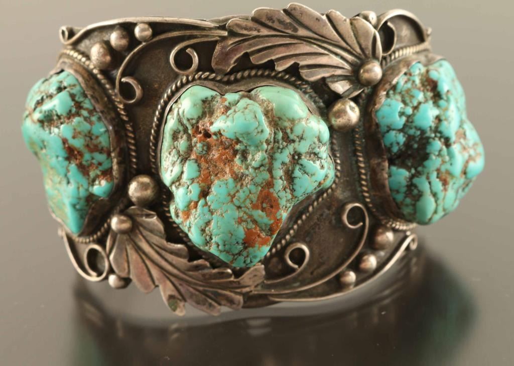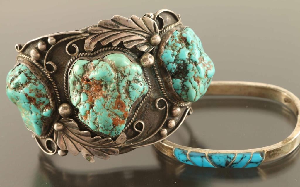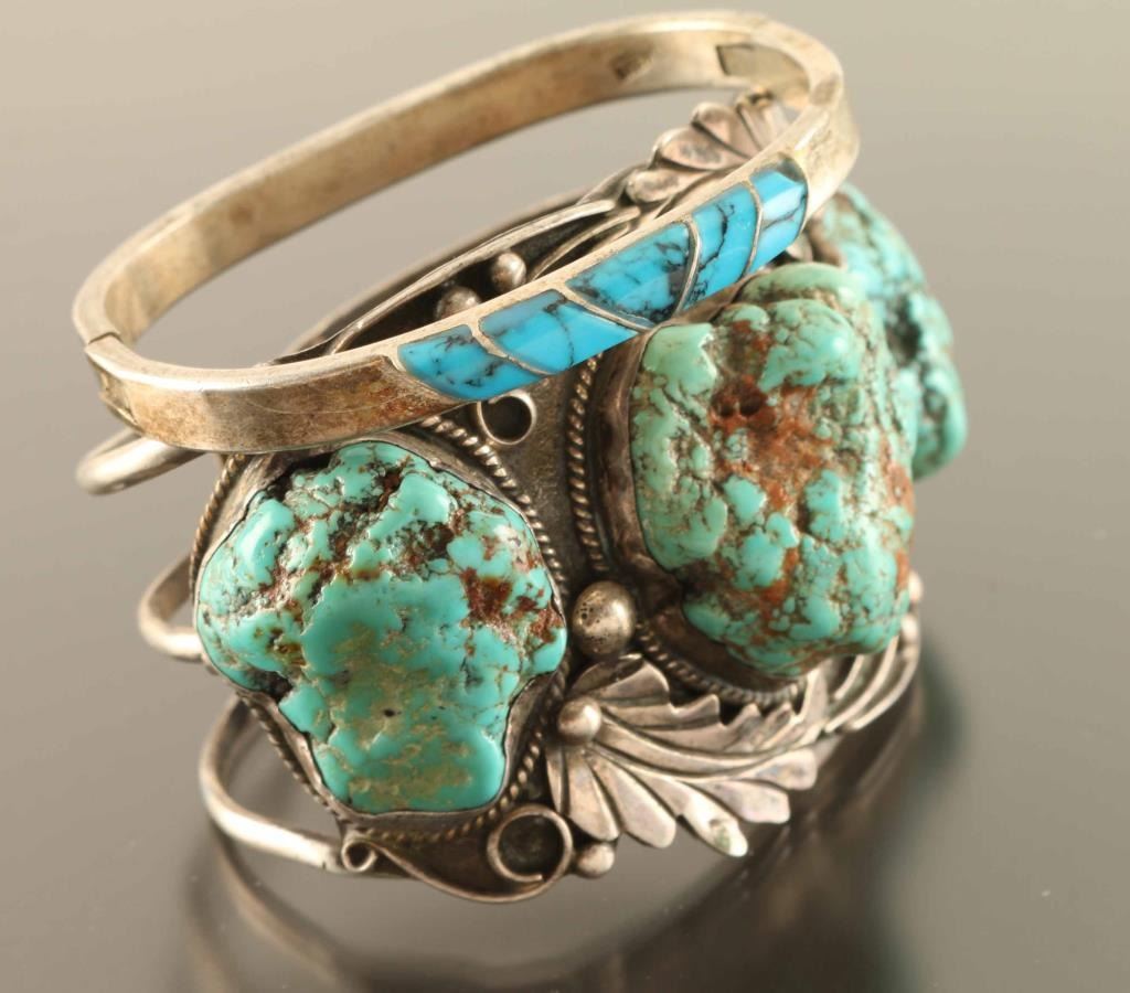 Includes a large man's silver cuff with three large turquoise nuggets, and a thinner silver hinged clasp with turquoise inlay. Both appear to fit the same size wrist. Larger piece is marked "JAP" on back.