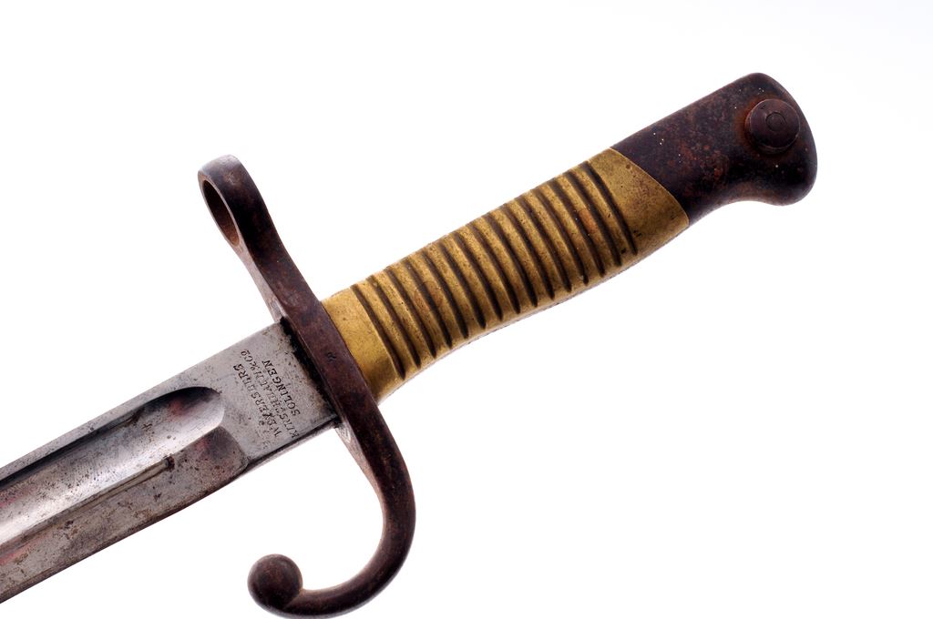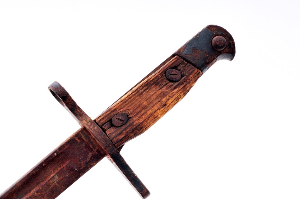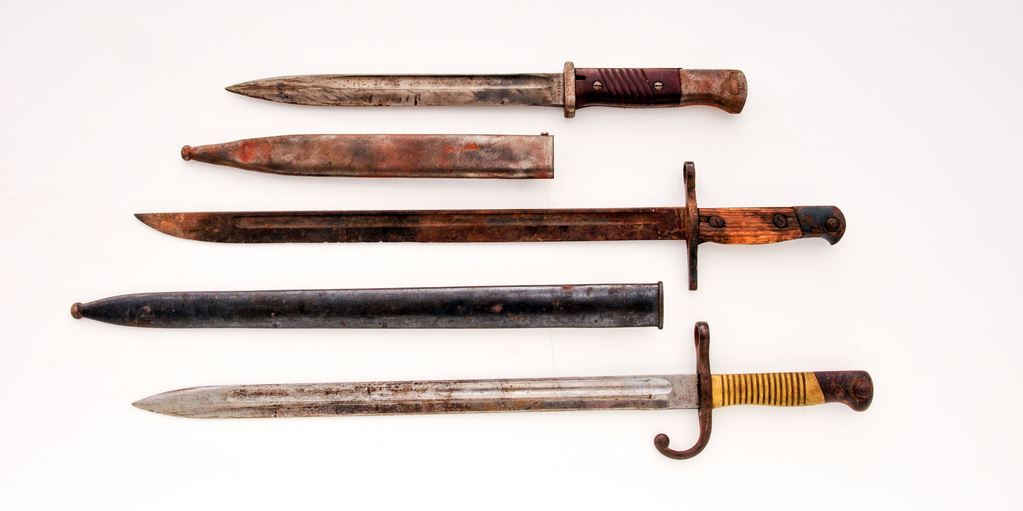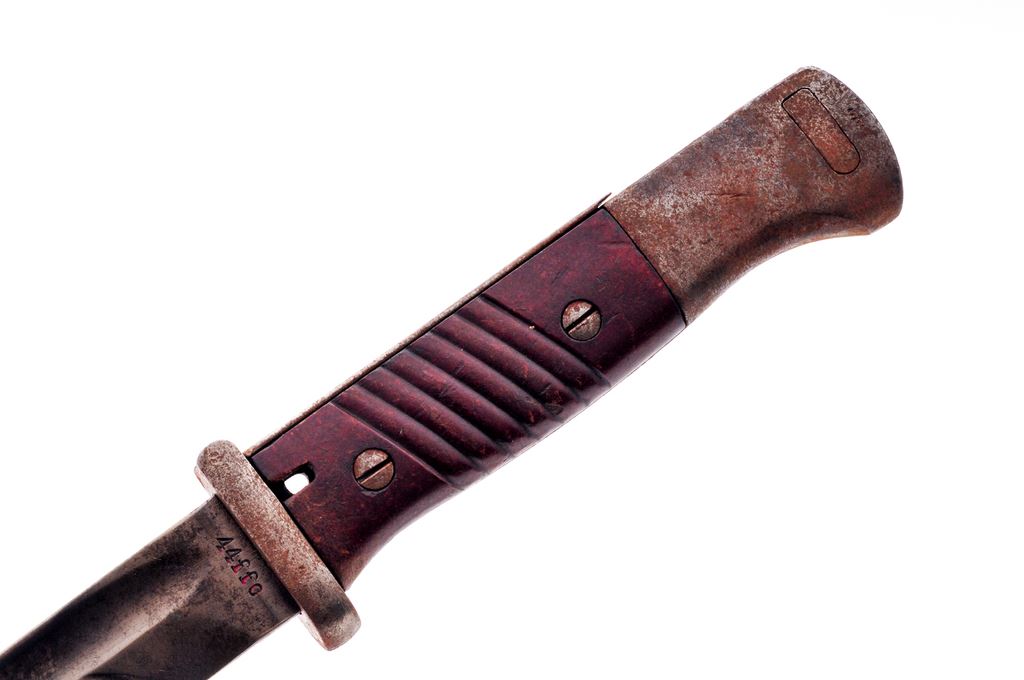 Lot of Three (3) Bayonets: 1.) Argentine Mauser bayonet with grooved brass handle and blued steel scabbard. Blade shows light sharpening. Argentine crest ground off at the blade ricasso. Matching numbered blade and scabbard, but blade numbers are partially ground off. Fair condition. 2.) Japanese WWII Arisaka bayonet without scabbard, in relic condition. 3.) Nazi WWII K98 bayonet, ''44 ffc'' marked blade, matching numbered scabbard, but scabbard numbers have been mostly ground off. Bakelite grip panels. Blade has grinding marks and no finish remaining. Est.: $100-$250/lot.