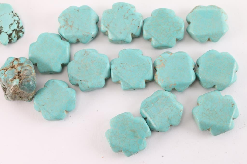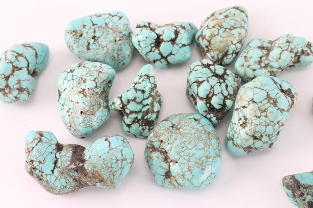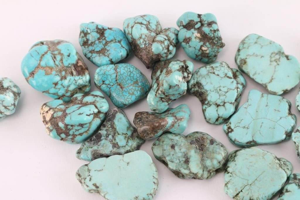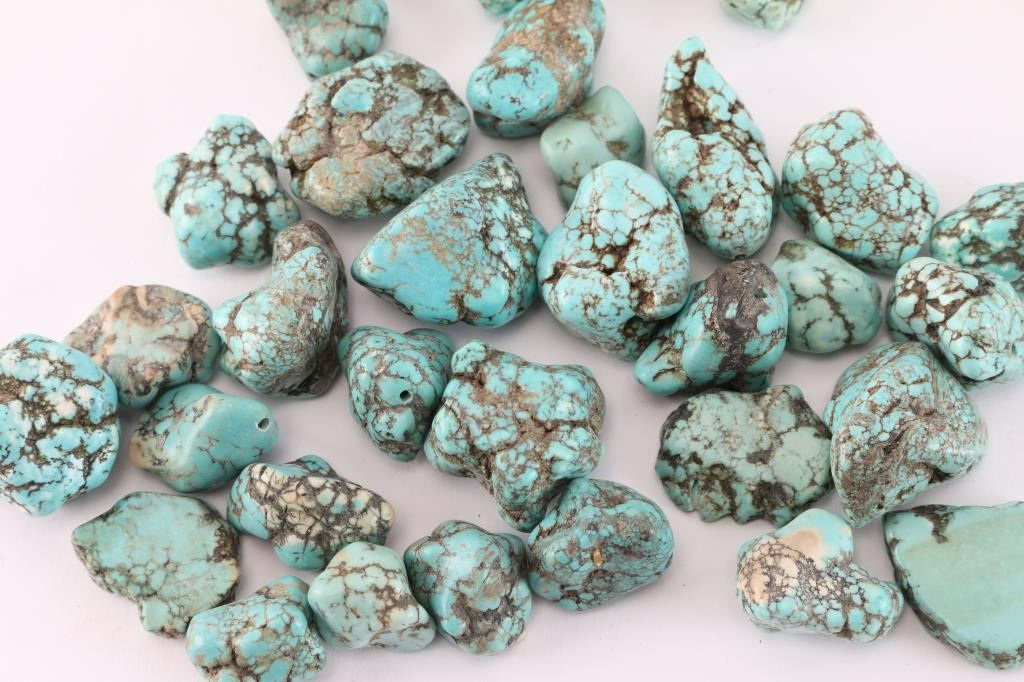 2.45 lbs (1,111g) of natural and tumbled turquoise stones. Some have been tumbled, cut and drilled for jewelry.