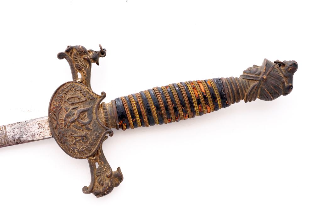 Lot of Two (2) Fraternal Swords with etched decorated blades: 1.) Knight's head pommel with recumbent lion on top of helmet, leather covered grip with stippled flat band wire wrapping, crossguard with shield and ''UR''. Blade is named to ''George Stelzle'' and is maker marked at ricasso by John Wolf, New Haven, Ct.. Scabbard is nickel plated with high relief fittings. Blade measures 28'' and overall length is 37''. Shows age, losses to the leather wrapping on the grip, rust and staining on the blade, and rust on the scabbard. Missing chain from grip to pommel. 2.) Knight's helmet pommel with eagle perched on top, black ebony wood grip, etched decorated blade with ''A.O.U.W.'' and named to ''C.A.Donnely''. Maker marked at ricasso by G.F. Foster and Son, Chicago, ILL. Blade measures 32'', overall length is 40''. Metal scabbard was originally nickel plated but has lost most of its finish, some gray paint remaining on scabbard in some areas, with rust patina overall. Blade shows age graying and light rust patina overall. Est.: $200-$300/lot.